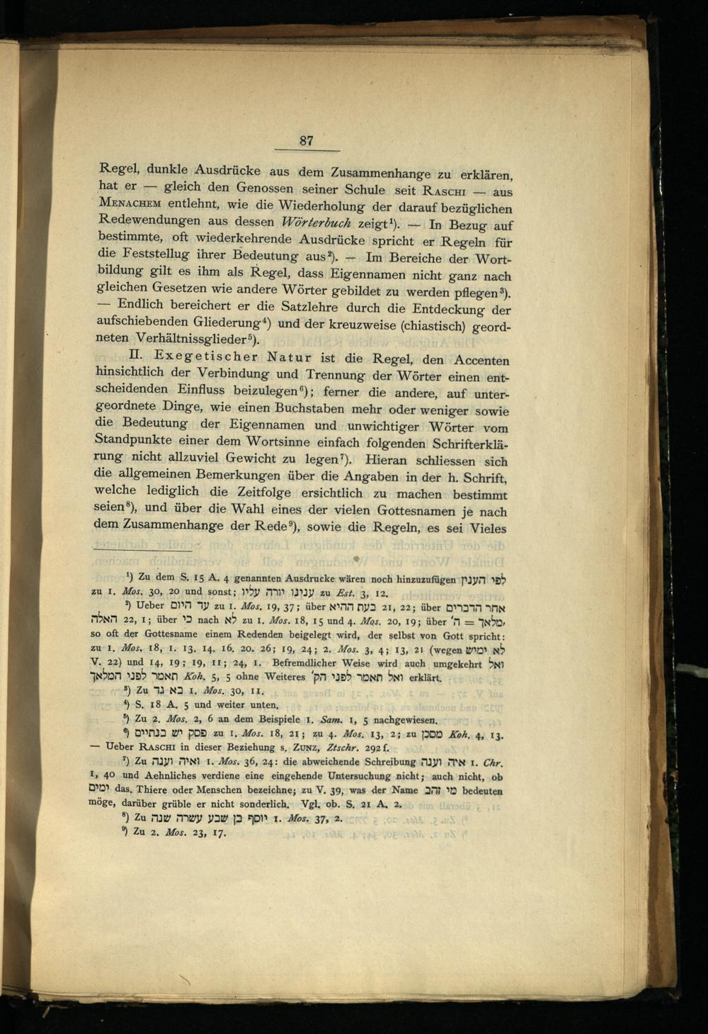 Regel, dunkle Ausdrücke aus dem Zusammenhange zu erklären, hat er— gleich‘ den Genossen seiner Schule seit Rasch— aus MeznacHeM entlehnt, wie die Wiederholung der darauf bezüglichen Redewendungen aus dessen Wörterbuch zeigt!).— In Bezug auf bestimmte, oft wiederkehrende Ausdrücke spricht er Regeln für die Feststellug ihrer Bedeutung aus”).— Im Bereiche der Wortbildung gilt es ihm als Regel, dass Eigennamen nicht ganz nach gleichen Gesetzen wie andere Wörter gebildet zu werden pflegen?). — Endlich bereichert er die Satzlehre durch die Entdeckung der aufschiebenden Gliederung“) und der kreuzweise(chiastisch) geordneten Verhältnissglieder®).
