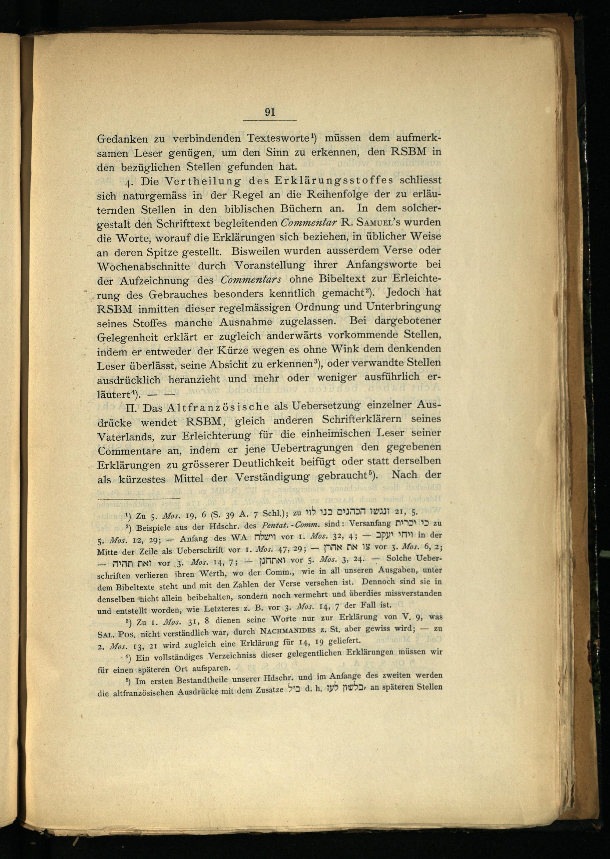 4. Die Vertheilung des Erklärungsstoffes schliesst sich naturgemäss in der Regel an die Reihenfolge der zu erläuternden Stellen in den biblischen Büchern an. In dem solchergestalt den Schrifttext begleitenden Commentar R. Samver’s wurden die Worte, worauf die Erklärungen sich beziehen, in üblicher Weise an deren Spitze gestellt. Bisweilen wurden ausserdem Verse oder Wochenabschnitte durch Voranstellung ihrer Anfangsworte bei der Aufzeichnung des Commentars ohne Bibeltext zur Erleichterung des Gebrauches besonders kenntlich gemacht?). Jedoch hat RSBM inmitten dieser regelmässigen Ordnung und Unterbringung seines Stoffes manche Ausnahme zugelassen. Bei dargebotener Gelegenheit erklärt er zugleich anderwärts vorkommende Stellen, indem er entweder der Kürze wegen es ohne Wink dem denkenden Leser überlässt, seine Absicht zu erkennen*®), oder verwandte Stellen ausdrücklich‘ heranzieht und mehr oder weniger ausführlich erläutert*).——