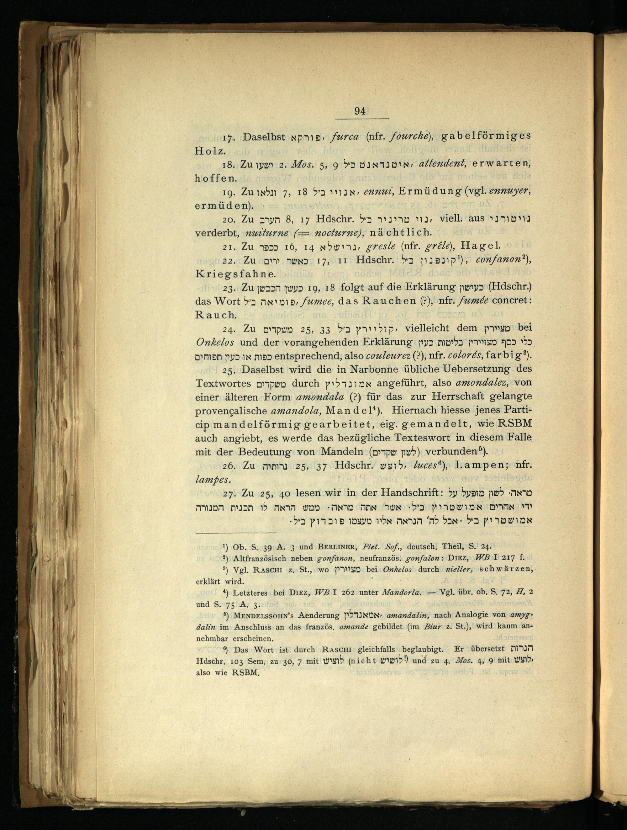 25. Daselbst wird die in Narbonne übliche Uebersetzung des Textwortes m"pwnp durch pıbannN angeführt, also amondalez, von einer älteren Form amondala(?) für das zur Herrschaft gelangte provencalische amandola, Man de1*). Hiernach hiesse jenes Particip mandelförmig gearbeitet, eig. gemandelt, wie RSBM auch angiebt, es werde das bezügliche Texteswort in diesem Falle mit der Bedeutung: von Mandeln(mw no) verbunden).