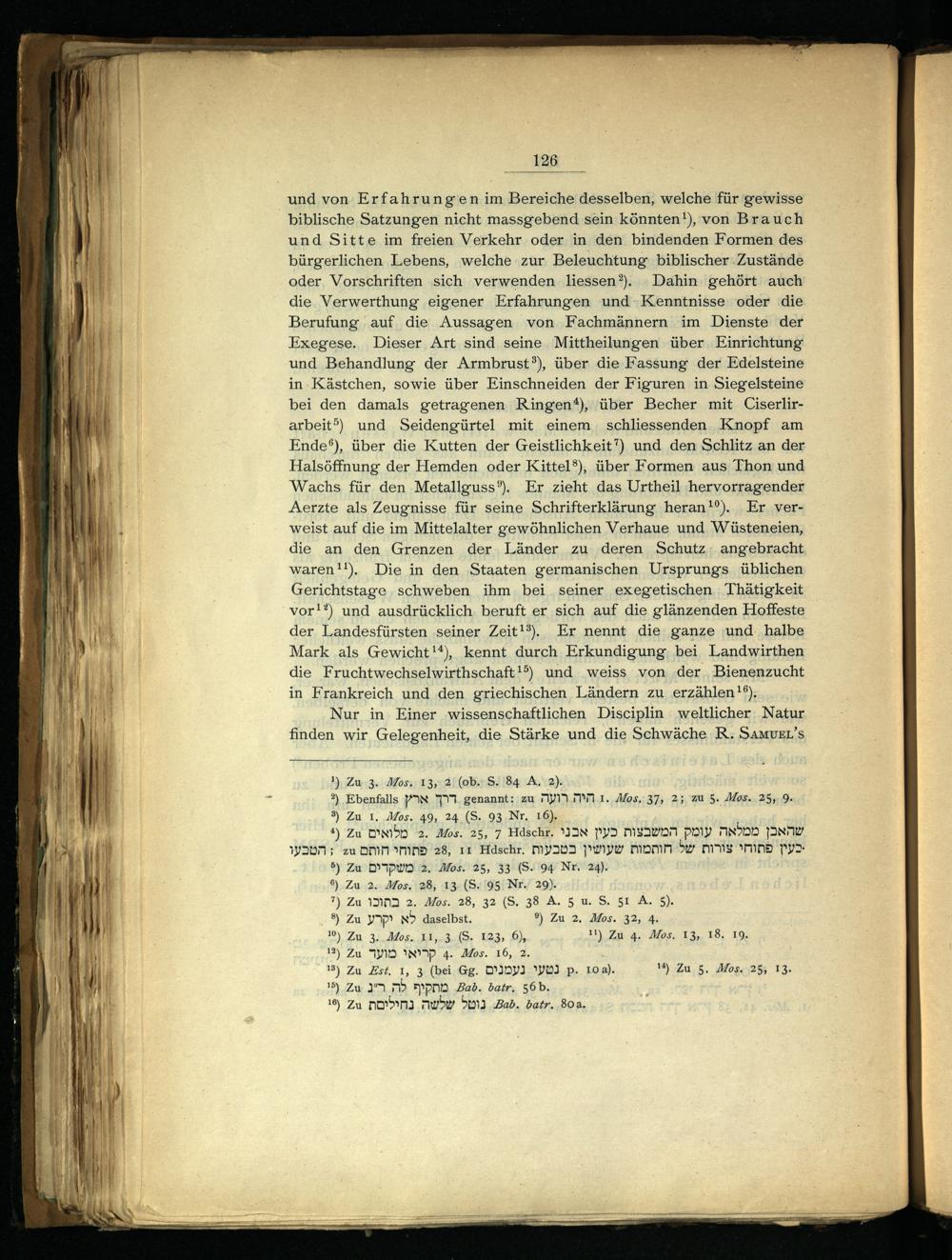 und von Erfahrung en im Bereiche desselben, welche für gewisse biblische Satzungen nicht massgebend sein könnten‘), von Brauch und Sitte im freien Verkehr oder in den. bindenden Formen des bürgerlichen Lebens, welche zur Beleuchtung biblischer Zustände oder, Vorschriften ‚sich verwenden liessen?). Dahin gehört auch die Verwerthung eigener Erfahrungen und Kenntnisse oder‘die Berufung auf die Aussagen von Fachmännern im Dienste der Exegese. Dieser Art sind seine Mittheilungen über Einrichtung und Behandlung der Armbrust®), über die Fassung der Edelsteine in-Kästchen, sowie über Einschneiden der Figuren in Siegelsteine bei den damals getragenen Ringen*), über Becher mit Ciserlirarbeit”) und Seidengürtel mit einem schliessenden Knopf am Ende®), über die Kutten der Geistlichkeit’) und den Schlitz an der Halsöffnung der Hemden oder Kittel®), über Formen aus Thon und Wachs für den Metallguss®). Er zieht das Urtheil hervorragender Aerzte als Zeugnisse für seine Schrifterklärung heran‘). Er verweist auf die im Mittelalter gewöhnlichen Verhaue und Wüsteneien, die an den Grenzen der. Länder zu deren Schutz: angebracht waren!!). Die in den Staaten germanischen Ursprungs üblichen Gerichtstage schweben ihm bei seiner exegetischen Thätigkeit vor!’) und ausdrücklich. beruft er sich auf die glänzenden Hoffeste der Landesfürsten ‚seiner Zeit!®. Er nennt die ganze ‚und. halbe Mark als Gewicht!*), kennt durch Erkundigung, bei Landwirthen die Fruchtwechselwirthschaft!?) und weiss von ‚der, Bienenzucht in Frankreich und den griechischen Ländern zu erzählen!‘);