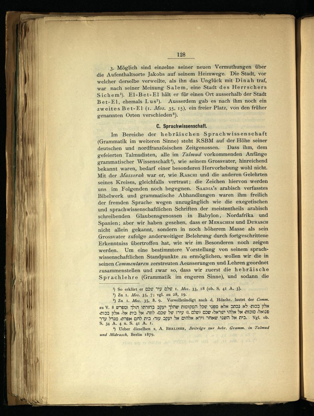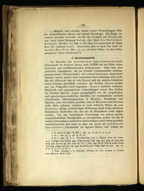 Im Bereiche der hebräischen Sprachwissenschaft (Grammatik im weiteren Sinne) steht RSBM auf der Höhe seiner deutschen und nordfranzösischen Zeitgenossen. Dass ihm, dem gefeierten Talmudisten, alle im Zalmud vorkommenden Anfänge grammatischer Wissenschaft*), wie seinem Grossvater, hinreichend bekannt waren, bedarf einer besonderen Hervorhebung wohl nicht. Mit der Massorah war er, wie Rascmı und die anderen Gelehrten seines Kreises, gleichfalls vertraut; die Zeichen hiervon werden uns im Folgenden noch begegnen. SaAADıa’s arabisch verfasstes Bibelwerk und grammatische Abhandlungen waren ihm freilich der fremden Sprache wegen unzugänglich wie die exegetischen und sprachwissenschaftlichen Schriften der meistentheils arabisch schreibenden Glaubensgenossen in Babylon, Nordafrika und Spanien; aber wir haben gesehen, dass er MEnAcCHEM und DUNASCH nicht allein gekannt, sondern in noch höherem Masse als sein Grossvater zufolge anderweitiger Belehrung durch fortgeschrittene Erkenntniss übertroffen hat, wie wir im Besonderen noch zeigen werden. Um eine bestimmtere Vorstellung von seinem sprachwissenschaftlichen Standpunkte zu ermöglichen, wollen wir die in seinen Commentaren zerstreuten Aeusserungen und Lehren geordnet zusammenstellen und zwar so, dass wir zuerst die hebräische Sprachlehre(Grammatik im engeren Sinne), und sodann die