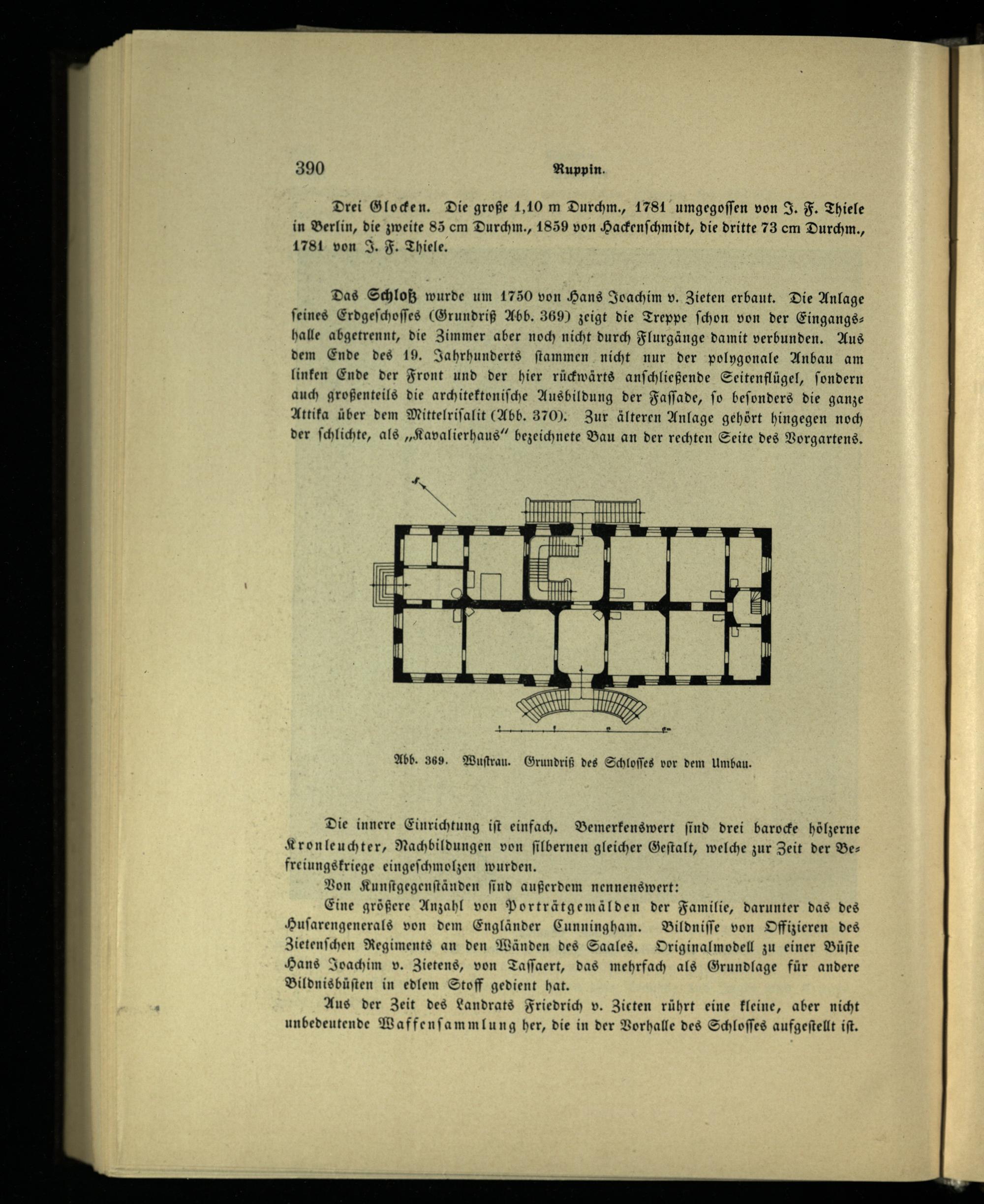 Das Schloß wurde um 1750 von Hans Joachim v. Zieten erbaut. Die Anlage feines Erdgeſchoſſes(Grundriß Abb. 369) zeigt die Treppe ſchon von der Eingangs— halle abgetrennt, die Zimmer aber noch nicht durch Flurgänge damit verbunden. Aus dem Ende des 19. Jahrhunderts ſtammen nicht nur der polygonale Anbau am linken Ende der Front und der hier rückwärts anſchließende Seitenflügel, ſondern auch großenteils die architektoniſche Ausbildung der Faſſade, ſo beſonders die ganze Attika über dem Mittelriſalit(Abb. 370). Zur älteren Anlage gehört hingegen noch der ſchlichte, als„Kavalierhaus“ bezeichnete Bau an der rechten Seite des Vorgartens.