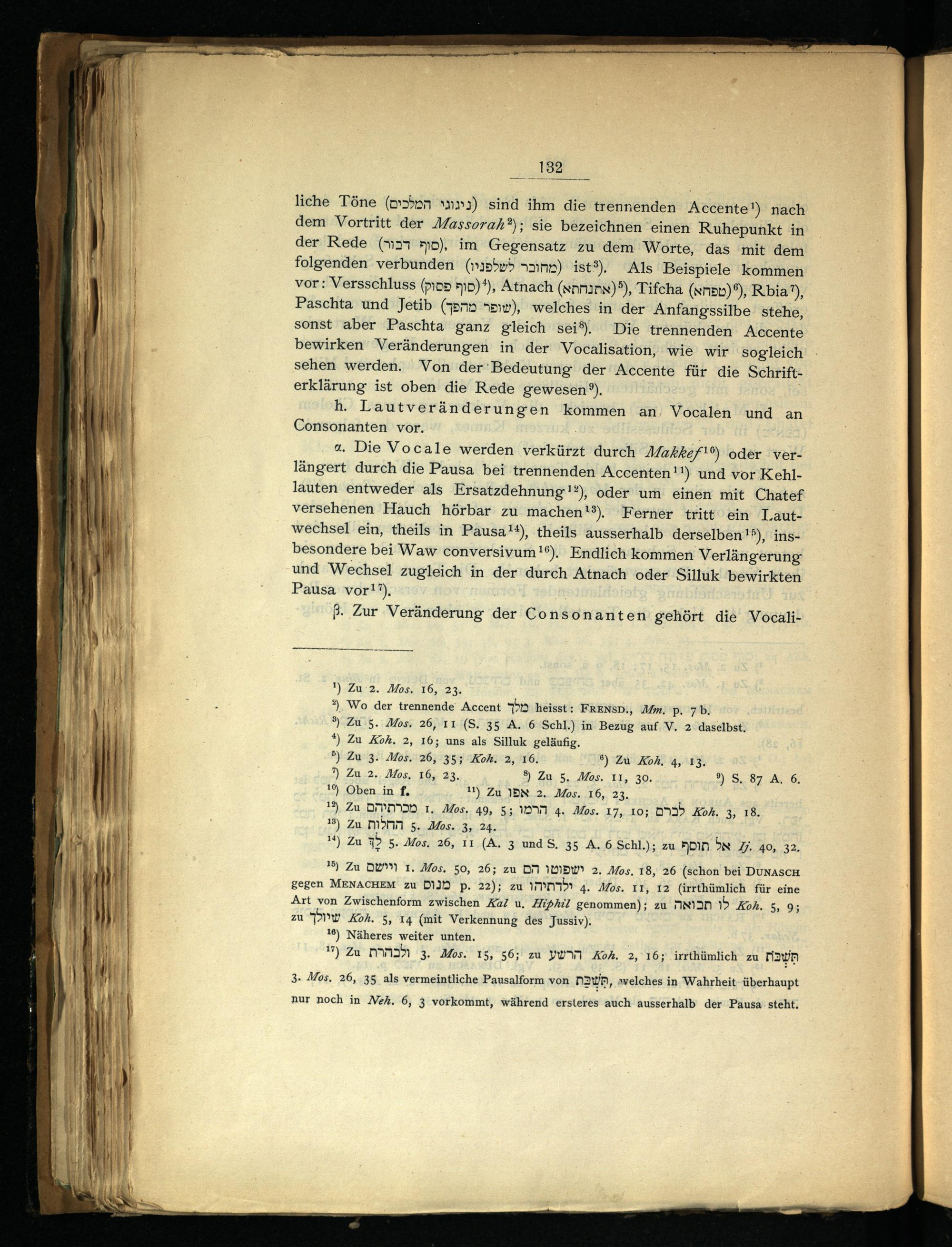 4. Die Vocale werden verkürzt durch Makkef‘°) oder verlängert durch die Pausa bei trennenden Accenten!!) und vor Kehllauten entweder als Ersatzdehnung!*), oder um einen mit Chatef versehenen Hauch hörbar zu machen‘). Ferner tritt ein Lautwechsel ein, theils in Pausa!*), theils ausserhalb derselben!®), insbesondere bei Waw conversivum 16), Endlich kommen Verlängerung und Wechsel zugleich in der durch Atnach oder Silluk bewirkten Pausa vor!”).