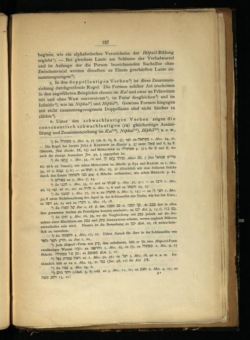 x. In den doppellautigen Verben‘*®) ist diese Zusammen‚ziehung durchgreifende Regel. Die Formen solcher Art erscheinen in den angeführten Beispielen ebenso im Kal und zwar im Präteritum mit und ohne Waw conversivum“), im Futur desgleichen”) und im Infinitiv‘), wie im Nzphal") und Hiphil®). Gewisse Formen hingegen mit nicht zusammengezogenem Doppellaute sind nicht hierher zu zählen).