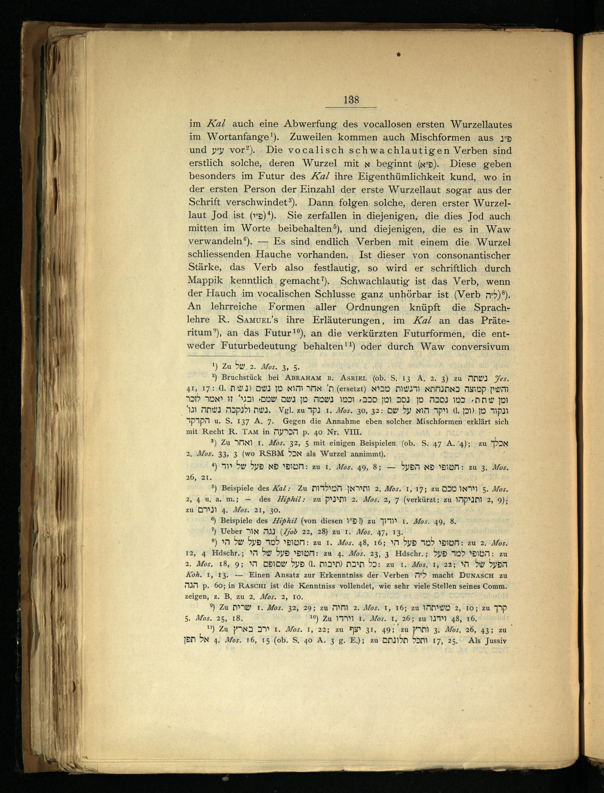 im Kal auch eine Abwerfung des vocallosen ersten Wurzellautes im Wortanfange'). Zuweilen kommen auch Mischformen aus 35 und y'y vor”). Die vocalisch schwachlautigen Verben sind erstlich solche, deren Wurzel mit x. beginnt(x). Diese geben besonders im Futur des Kal ihre Eigenthümlichkeit kund, wo in der ersten Person der Einzahl der erste Wurzellaut sogar aus der Schrift verschwindet?). Dann folgen, solche, deren erster Wurzellaut Jod ist(759)*). Sie zerfallen in diejenigen, die dies Jod auch mitten im Worte beibehalten®), und diejenigen, die es in Waw verwandeln®).— Es sind endlich Verben. mit einem die Wurzel schliessenden Hauche vorhanden. Ist dieser von consonantischer Stärke, das Verb also festlautig, so wird er schriftlich durch Mappik kenntlich gemacht”). Schwachlautig ist das Verb, wenn der Hauch im vocalischen Schlusse ganz unhörbar ist(Verb m5)®) An lehrreiche Formen aller Ordnungen knüpft die Sprachlehre R. Samvzı’s ihre Erläuterungen, im Kal an das Präteritum”), an das Futur!°), an die verkürzten Futurformen, die entweder F uturbedeutung behalten!!) oder durch Waw conversivum