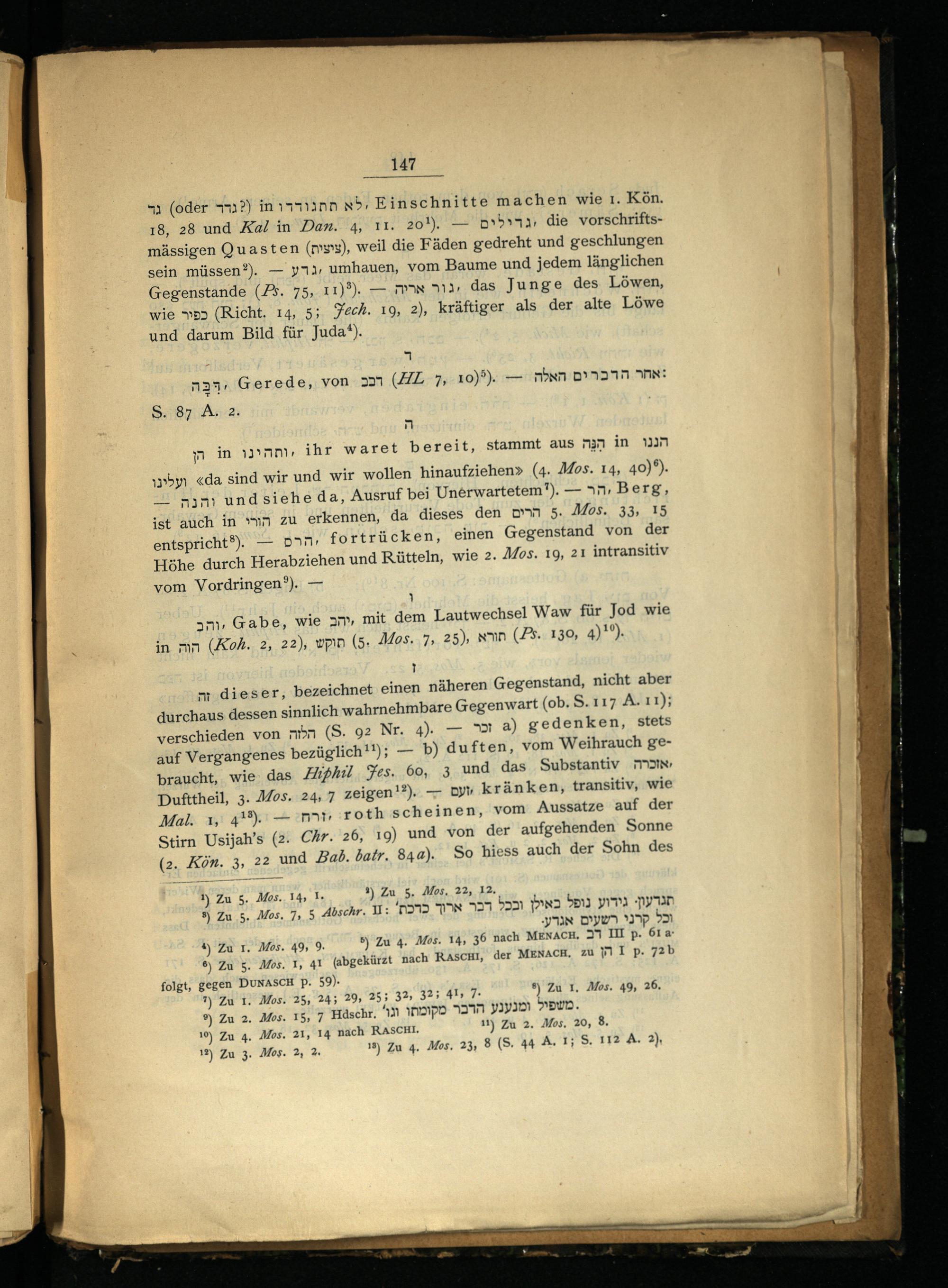 “3(oder 711?) in 1770 xb5, Einschnitte machen wie ı. Kön. 18, 28 und Kal in Dan. 4, 11. 201).— D1bY7a die vorschriftsmässigen Quasten(mw), weil die Fäden gedreht und geschlungen sein müssen?).— yıı, umhauen, vom Baume und jedem länglichen Gegenstande(Z%. 75, 11)”).— JPN 11 das Junge des Löwen, wie»85(Richt. 14, 5; Tech. 19, 2), kräftiger als der alte Löwe und darum Bild für Juda*).