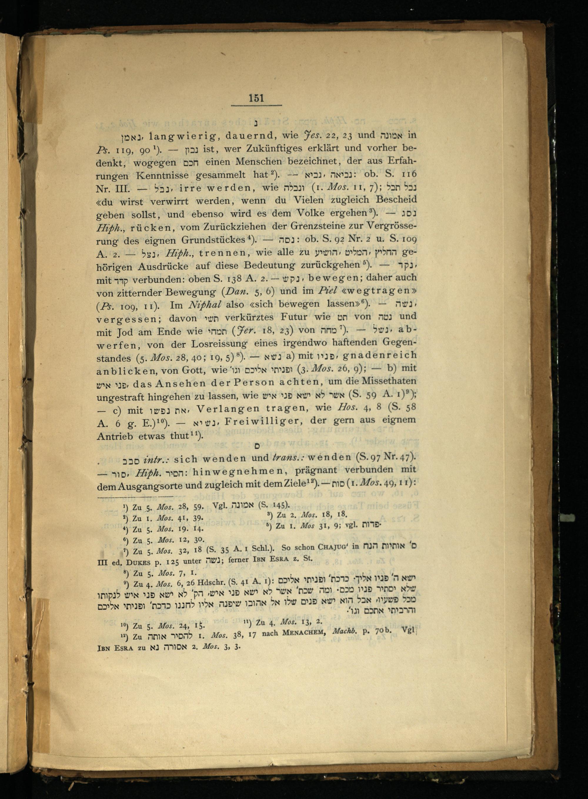 px langwierig, dauernd, wie Jes. 22, 23 und AndN in Ps. 119, 90').— ya ist, wer Zukünftiges erklärt und vorher bedenkt, wogegen nam einen Menschen bezeichnet, der aus Erfahrungen Kenntnisse gesammelt hat).—— /wnı, mw: ob. S. 116 Nr. IE—! 55). irre werden, wie man(1. Mos. 11, 7); bar b33 «du wirst verwirrt werden, wenn du Vielen zugleich Bescheid geben sollst, und ebenso wird es'dem Volke ergehen?®).— 153 Hiph., rücken, vom Zurückziehen der Grenzsteine zur Vergrösserung des eignen Grundstückes*).— nd3: ob. S. 92 Nr. 2 u. S. 109 A.'2.— bsy, Hiph., trennen, wie alle zu yının, van ponn gehörigen Ausdrücke auf diese Bedeutung zurückgehen 5).— Pd mit 11p verbunden: oben'S. 138 A. 2.— wp3, bewegen; daher auch von zitternder Bewegung(Dan. 5, 6) und im Piel«wegtragen>» (Ps. 109, 11). Im Niphal also«sich bewegen lassen»®).— nw3, vergessen; davon 1m verkürztes Futur wie on von nö) und mit Jod am Ende wie nnpn(Fer. 18, 23) von nmo*).— 5wi, abwerfen, von der Losreissung‘ eines irgendwo haftenden Gegenstandes(5. Mos. 28, 40; 19, 5)®).— xwı'a) mit 715, gnadenreich anblicken, von Gott, wie 431 a» 5(3: Mos. 26, 9);— b) mit vn u5, das Ansehen der Person achten, um die Missethaten ungestraft hingehen zu lassen, wie zn 15 NW RN(S. 59 A71)?) — c) mit 1wB3 DN- Verlangen tragen, wie Hos. 4, 8(S. 58 A. 6 g. E.)').— x1wy3, Freiwilliger, der gern aus eignem Antrieb etwas thut**).