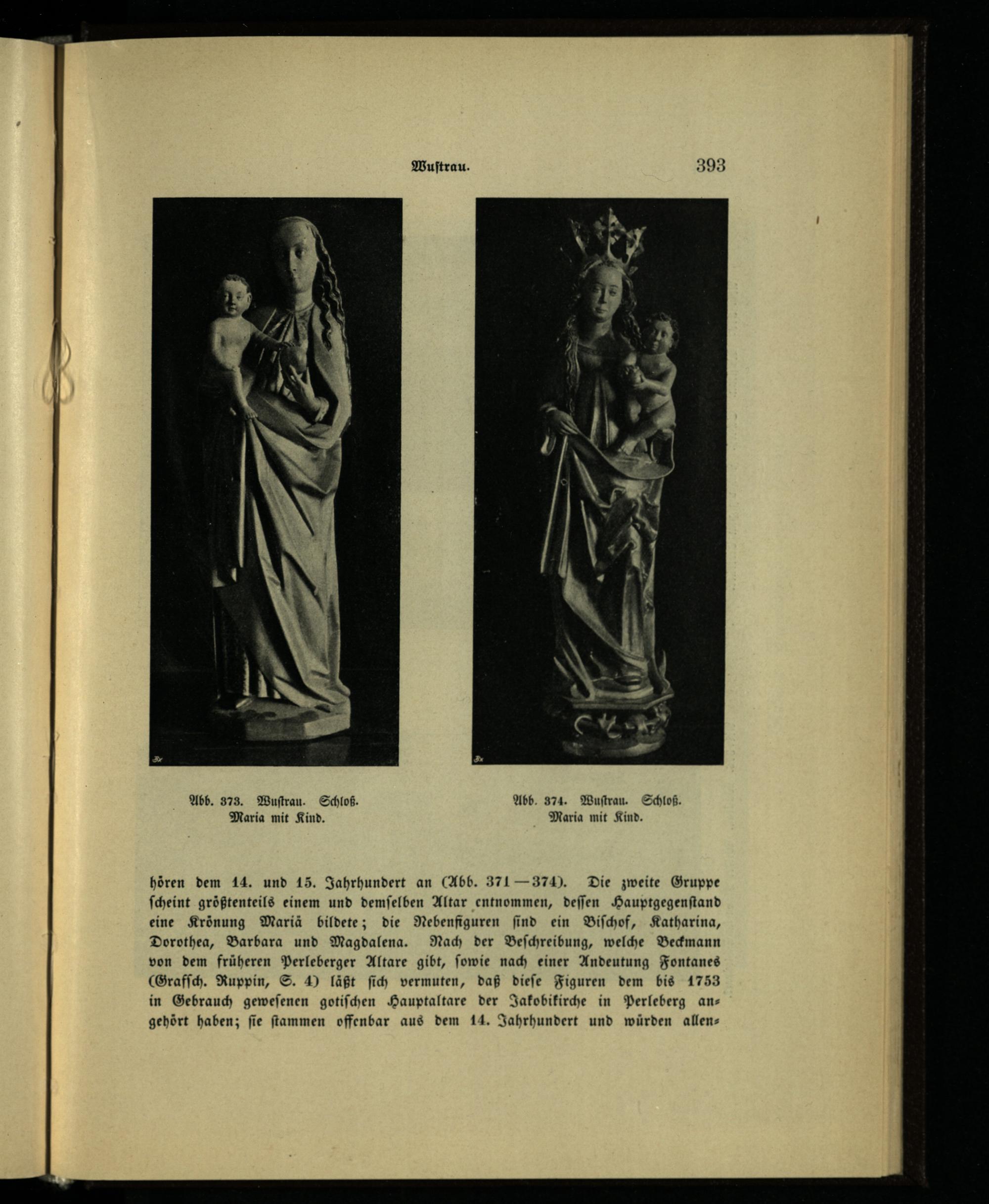 hören dem 14. und 15. Jahrhundert an(Abb. 371— 374). Die zweite Gruppe ſcheint größtenteils einem und demſelben Altar entnommen, deſſen Hauptgegenſtand eine Krönung Mariä bildete; die Nebenfiguren ſind ein Biſchof, Katharina, Dorothea, Barbara und Magdalena. Nach der Beſchreibung, welche Beckmann von dem früheren Perleberger Altare gibt, ſowie nach einer Andeutung Fontanes (Grafſch. Ruppin, S. 4) läßt ſich vermuten, daß dieſe Figuren dem bis 1753 in Gebrauch geweſenen gotiſchen Hauptaltare der Jakobikirche in Perleberg angehört haben; ſie ſtammen offenbar aus dem 14. Jahrhundert und würden allen