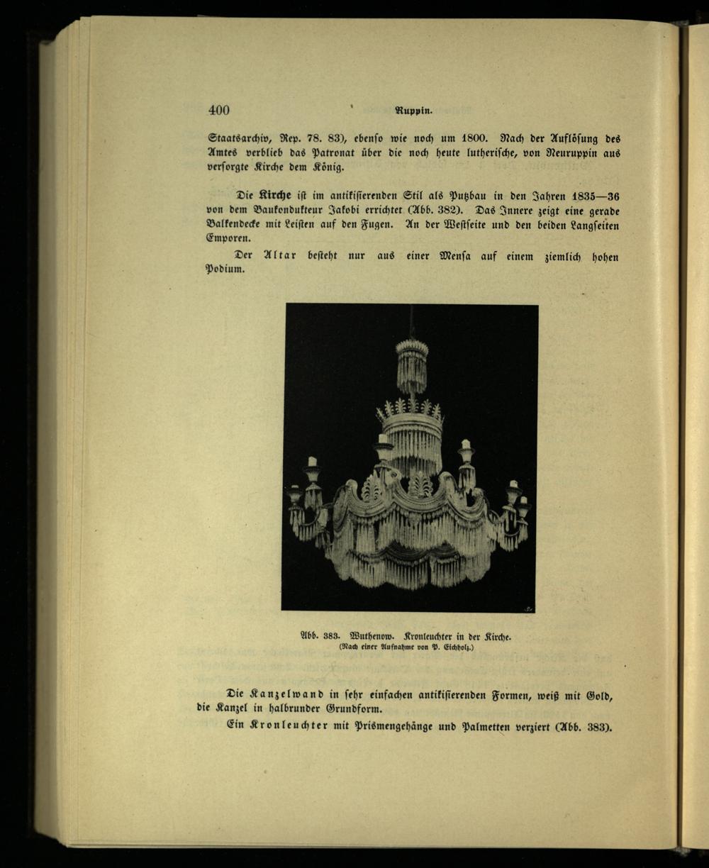 Die Kanzelwand in ſehr einfachen antikiſierenden Formen, weiß mit Gold, die Kanzel in halbrunder Grundform. Ein Kronleuchter mit Prismengehänge und Palmetten verziert(Abb. 383).