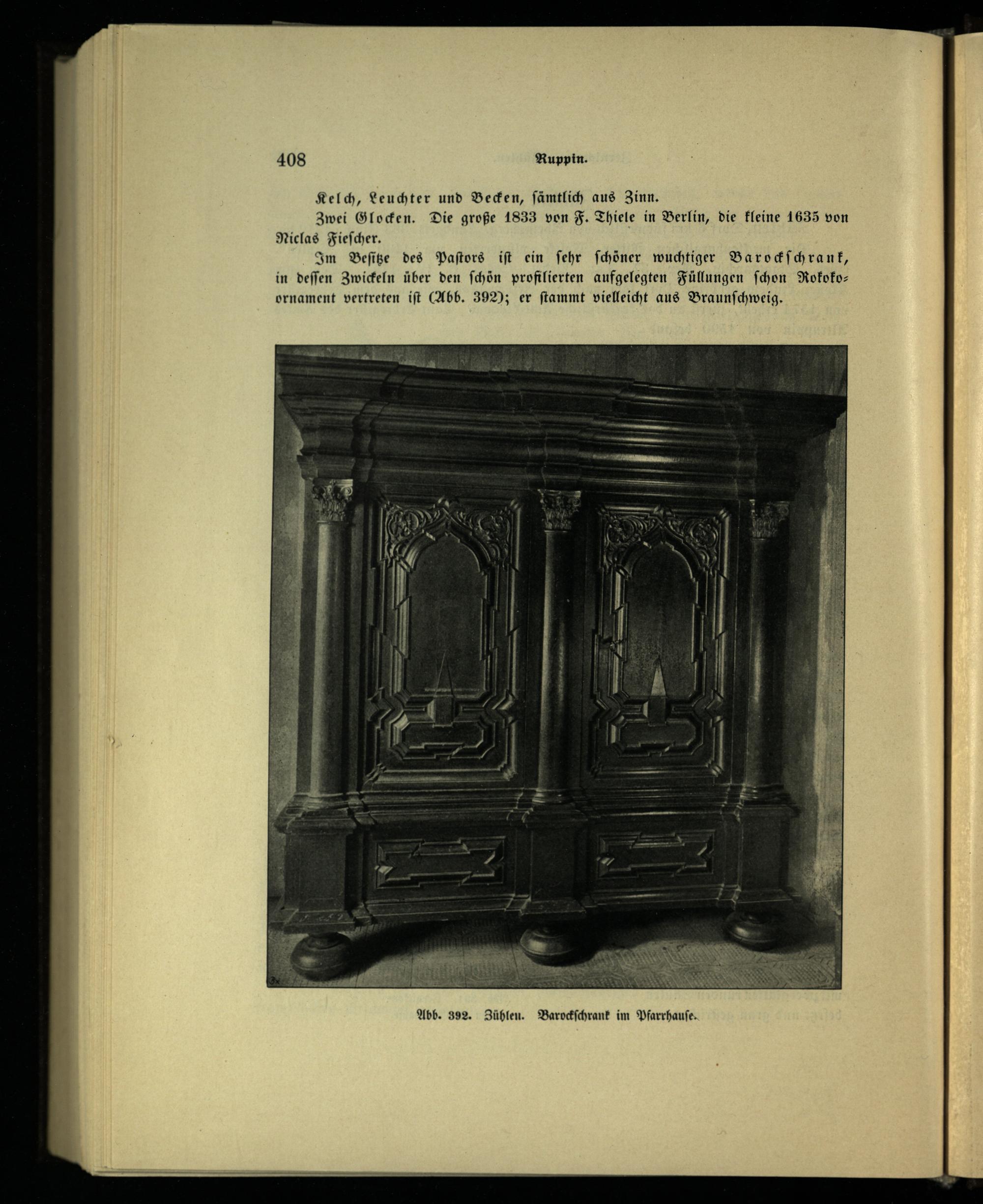 Im Beſitze des Paſtors iſt ein ſehr ſchöner wuchtiger Barockſchrank, in deſſen Zwickeln über den ſchön profilierten aufgelegten Füllungen ſchon Rokokoornament vertreten iſt(Abb. 392); er ſtammt vielleicht aus Braunſchweig .