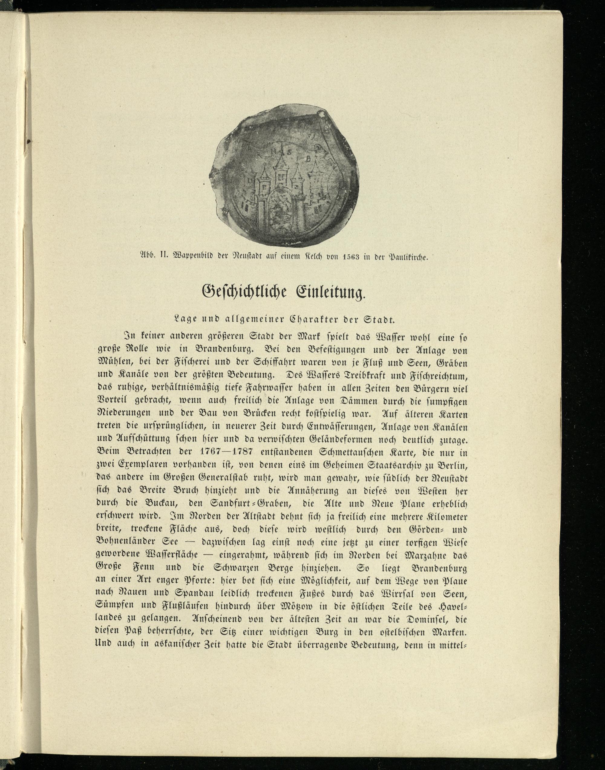 In keiner anderen größeren Stadt der Mark ſpielt das Waſſer wohl eine ſo große Rolle wie in Brandenburg . Bei den Befeſtigungen und der Anlage von Mühlen, bei der Fiſcherei und der Schiffahrt waren von je Fluß und Seen, Gräben und Kanäle von der größten Bedeutung. Des Waſſers Treibkraft und Fiſchreichtum, das ruhige, verhältnismäßig tiefe Fahrwaſſer haben in allen Zeiten den Bürgern viel Vorteil gebracht, wenn auch freilich die Anlage von Dämmen durch die ſumpfigen Niederungen und der Bau von Brücken recht koſtſpielig war. Auf älteren Karten treten die urſprünglichen, in neuerer Zeit durch Entwäſſerungen, Anlage von Kanälen und Aufſchüttung ſchon hier und da verwiſchten Geländeformen noch deutlich zutage. Beim Betrachten der 1767— 1787 entſtandenen Schmettauſchen Karte, die nur in zwei Exemplaren vorhanden iſt, von denen eins im Geheimen Staatsarchiv zu Berlin , das andere im Großen Generalſtab ruht, wird man gewahr, wie ſüdlich der Neuſtadt ſich das Breite Bruch hinzieht und die Annäherung an dieſes von Weſten her durch die Buckau , den Sandfurt-Graben, die Alte und Neue Plane erheblich erſchwert wird. Im Norden der Altſtadt dehnt ſich ja freilich eine mehrere Kilometer breite, trockene Fläche aus, doch dieſe wird weſtlich durch den Görden- und Bohnenländer See— dazwiſchen lag einſt noch eine jetzt zu einer torfigen Wieſe gewordene Waſſerfläche— eingerahmt, während ſich im Norden bei Marzahne das Große Fenn und die Schwarzen Berge hinziehen. So liegt Brandenburg an einer Art enger Pforte: hier bot ſich eine Möglichkeit, auf dem Wege von Plaue nach Nauen und Spandau leidlich trockenen Fußes durch das Wirrſal von Seen, Sümpfen und Flußläufen hindurch über Mötzow in die öſtlichen Teile des Havel ; landes zu gelangen. Anſcheinend von der älteſten Zeit an war die Dominſel, die dieſen Paß beherrſchte, der Sitz einer wichtigen Burg in den oſtelbiſchen Marken. Und auch in askaniſcher Zeit hatte die Stadt überragende Bedeutung, denn in mittel—