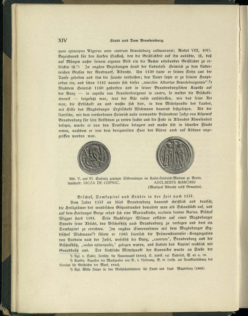 Vom Jahre 1157 an blieb Brandenburg dauernd chriſtlich und deutſch ; die Heiligtümer des wendiſchen Götzendienſtes bewahrte man als Schauſtücke auf, und auf dem Harlunger Berge erhob ſich eine Marienkirche, ecclesia beatae Mariae. Biſchof Wigger ſtarb 1161. Sein Nachfolger Wilmar erklärte auf einer Magdeburger Synode ſeine Abſicht, den Biſchofsſitz nach Brandenburg zu verlegen und dort ein Domkapitel zu errichten. Im engſten Einvernehmen mit dem Magdeburger Erzbiſchof Wichmann?) führte er 14165 feierlich die Prämonſtratenſer -Kongregation von Parduin nach der Inſel, woſelbſt die Burg,„castrum“, Brandenburg und der Biſchofsſitz,„sedes episcopalis,' gelegen waren, und ſtattete das Kapitel reichlich mit Grundbeſitz aus. Der kirchliche Mittelpunkt der Kanoniker wurde an Stelle der . 1) Vgl. v. Sallet, Zeitſchr. für Numismatik(1881), S. 249ff; vgl. Bahrfeld, S. 65 u. 79.