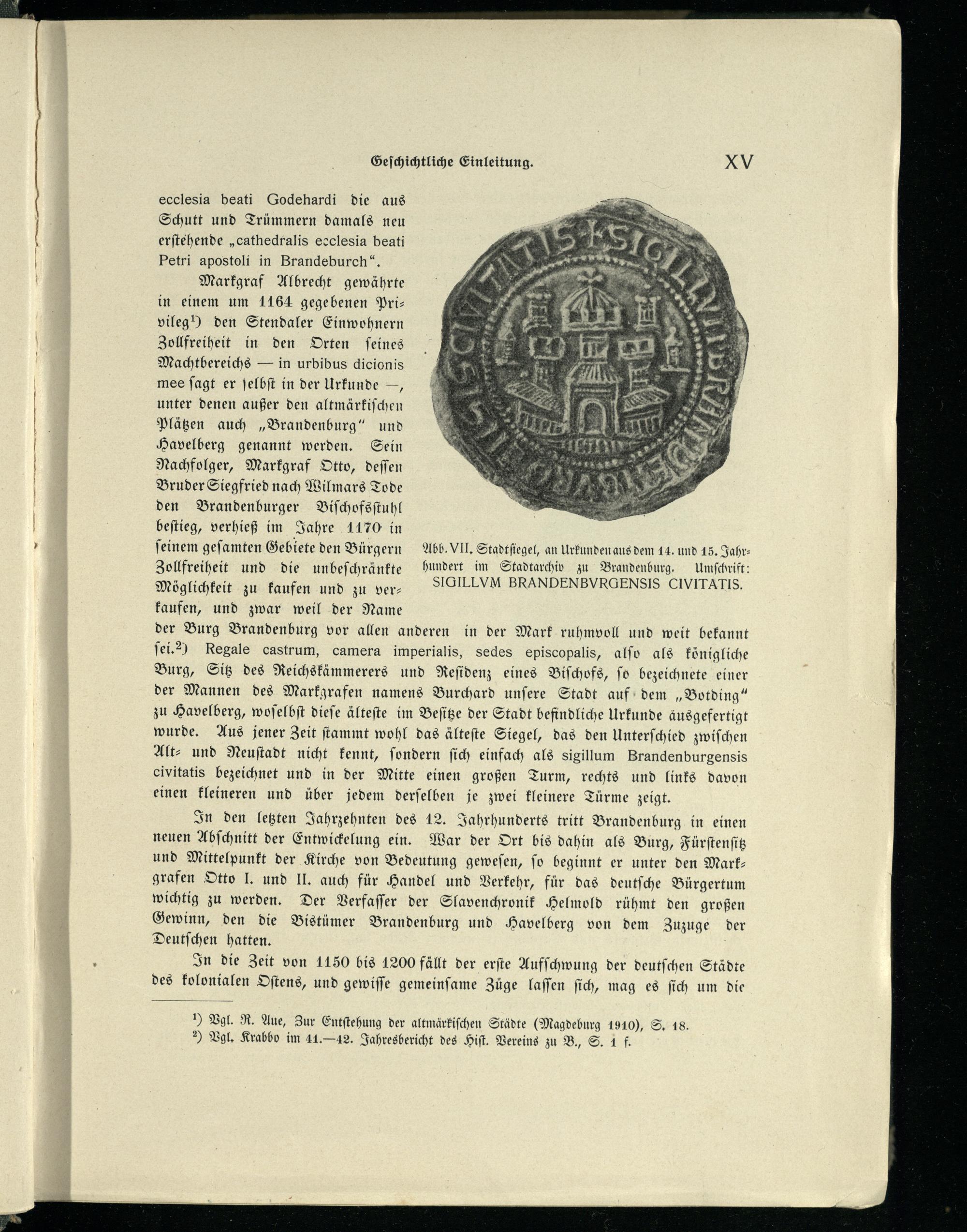 Markgraf Albrecht gewährte in einem um 1164 gegebenen Pri— vileg! den Stendaler Einwohnern Zollfreiheit in den Orten ſeines Machtbereichs— in urbibus dicionis mee ſagt er ſelbſt in der Urkunde— unter denen außer den altmärkiſchen Plätzen auch„Brandenburg “ und Havelberg genannt werden. Sein Nachfolger, Markgraf Otto, deſſen Bruder Siegfried nach Wil mars Tode den Brandenburger Biſchofsſtuhl beſtieg, verhieß im Jahre 1170 in ſeinem geſamten Gebiete den Bürgern Abb. VII. Stadtſiegel, an Urkunden aus dem 44. und 15. JahrZollfreiheit und die unbeſchränkte hundert im Stadtarchiv zu Brandenburg . Umſchrift: Möglichkeit zu kaufen und zu ver— SI GlLLVM BRANDENBVRKGENSIS CIVITATIS. kaufen, und zwar weil der Name der Burg Brandenburg vor allen anderen in der Mark ruhmvoll und weit bekannt ſei.) Regale castrum, camera imperialis, sedes ebiscopalis, alſo als königliche Burg, Sitz des Reichskämmerers und Reſidenz eines Biſchofs, ſo bezeichnete einer der Mannen des Markgrafen namens Burchard unſere Stadt auf dem„Botding“ zu Havelberg , woſelbſt dieſe älteſte im Beſitze der Stadt befindliche Urkunde ausgefertigt wurde. Aus jener Zeit ſtammt wohl das älteſte Siegel, das den Unterſchied zwiſchen Alt- und Neuſtadt nicht kennt, ſondern ſich einfach als sigillum Brandenburgensis civitatis bezeichnet und in der Mitte einen großen Turm, rechts und links davon einen kleineren und über jedem derſelben je zwei kleinere Türme zeigt.