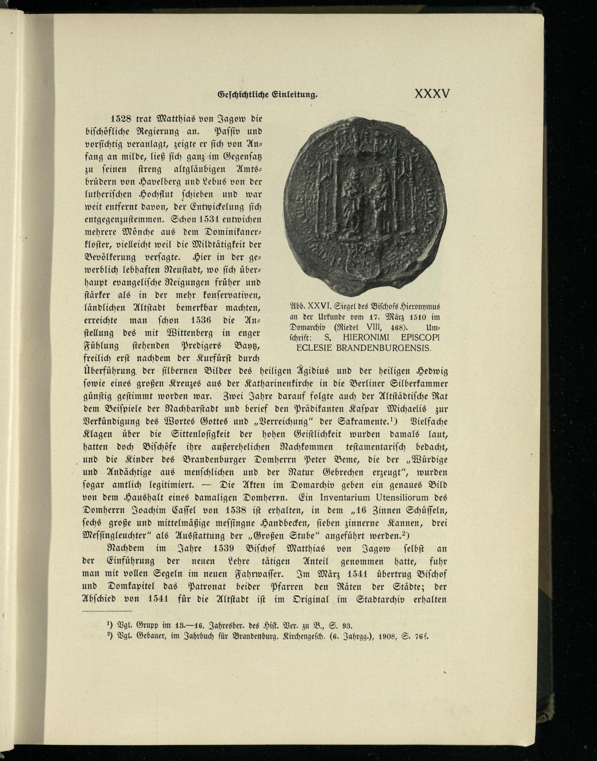 ländlichen Altſtadt bemerkbar machten, Abb. XXVI Siegel des Biſchofs Hieronymus erreichte man on 1536 die Anz an der Urkunde vom 147. März 1510 im l. des.;. Domarchiv(Riedel VI, 468). UmR des mit Aittenberg” Mm enger{rift: 8. HIERONIMI. EPISCOPI Fühlung ſtehenden Predigers Baytz, ECLESIE BRANDENBURGENSIS.