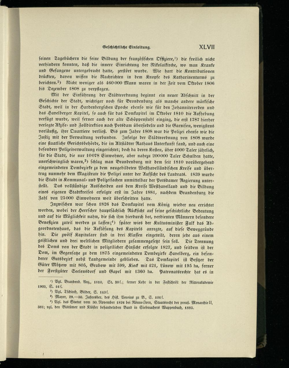 Inzwiſchen war ſchon 1826 das Domkapitel vom König wieder neu errichtet worden, wobei der Herrſcher hauptſächlich Rückſicht auf ſeine geſchichtliche Bedeutung und auf die Möglichkeit nahm, die ſich ihm hierdurch bot, verdienten Männern beſondere Benefizien zuteil werden zu laſſen; ſpäter wies der Kultusminiſter Falk das Abgeordnetenhaus, das die Auflöſung des Kapitels anregte, auf dieſe Beweggründe hin. Die zwölf Kapitulare ſind in drei Klaſſen eingeteilt, deren jede aus einem geiſtlichen und drei weltlichen Mitgliedern zuſammengeſetzt ſein ſoll. Die Trennung des Doms von der Stadt in polizeilicher Hinſicht erfolgte 1827, und ſeitdem iſt der Dom, im Gegenſatze zu dem 1875 eingemeindeten Dombezirke Havelberg , ein befonz derer Gutsbezirk nebſt Landgemeinde geblieben. Das Domkapitel iſt Beſitzer der Güter Mötzow mit 805, Grabow mit 599, Kieck mit 421, Lünow mit 195 ha, ferner der Forſtgüter Seelensdorf und Gapel mit 1360 ha. Patronatsrechte hat es in