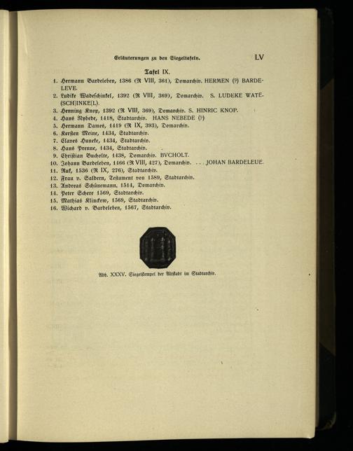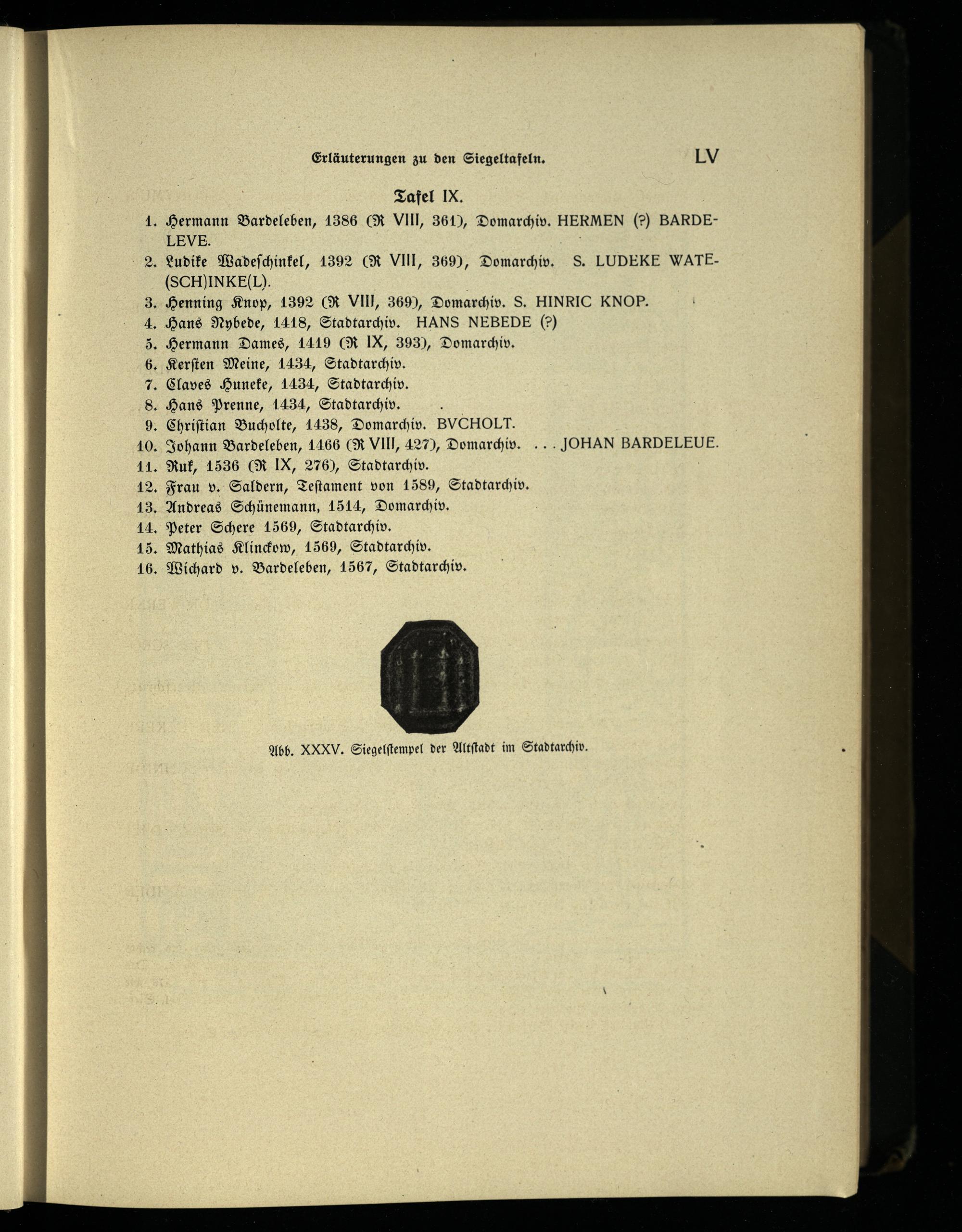 Tafel IX. Hermann Bardeleben, 1386(R VIII, 361), Domarchiv. HERMEN() BARDELEVE.; Ludike Wadeſchinkel, 1392(R VII, 369), Domarchiv. S. LUDEKE WATE(SCH)INKE(L). Henning Knop, 1392(R VIN, 369), Domarchiv. S. HINRIC KNOP. Hans Nybede, 1418, Stadtarchiv. HANS NEBEDE(9) Hermann Dames, 1419(R IX, 393), Domarchiv. Kerſten Meine, 1434, Stadtarchiv. Claves Huneke, 1434, Stadtarchiv. „Hans Prenne, 1434, Stadtarchiv. Chriſtian Bucholte, 1438, Domarchiv. BVCHOLT. 10. Johann Bardeleben, 1466(RwVlll, 427), Domarchiv.. JOHAN BARDELEUE. 11. Ruk, 1536(R IX, 276), Stadtarchiv. 12. Frau v. Saldern, Teſtament von 1589, Stadtarchiv. 13. Andreas Schünemann, 1514, Domarchiv. 14. Peter Schere 1569, Stadtarchiv. 15. Mathias Klinckow, 1569, Stadtarchiv. 16. Wichard v. Bardeleben, 1567, Stadtarchiv.