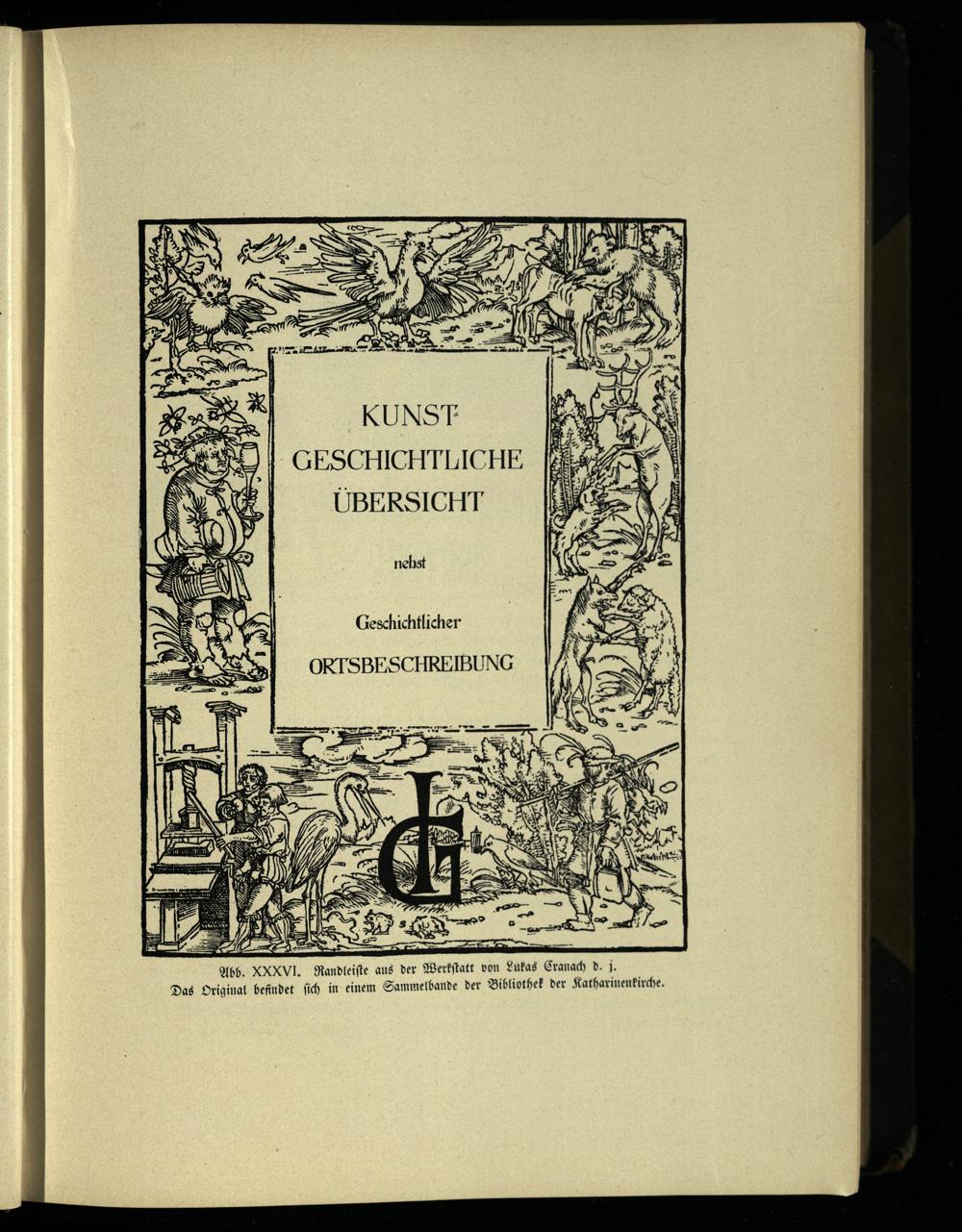 GESCHICHTLICHE ÜBERSICHT nehst Geschichtlicher ORTSBESCHREIBUNG Abb. XXXVI. Randleiſte aus der Werkſtatt von Lukas Cranach d. j. Das Original befindet ſich in einem Sammelbande der Bibliothek der Katharinenkirche.