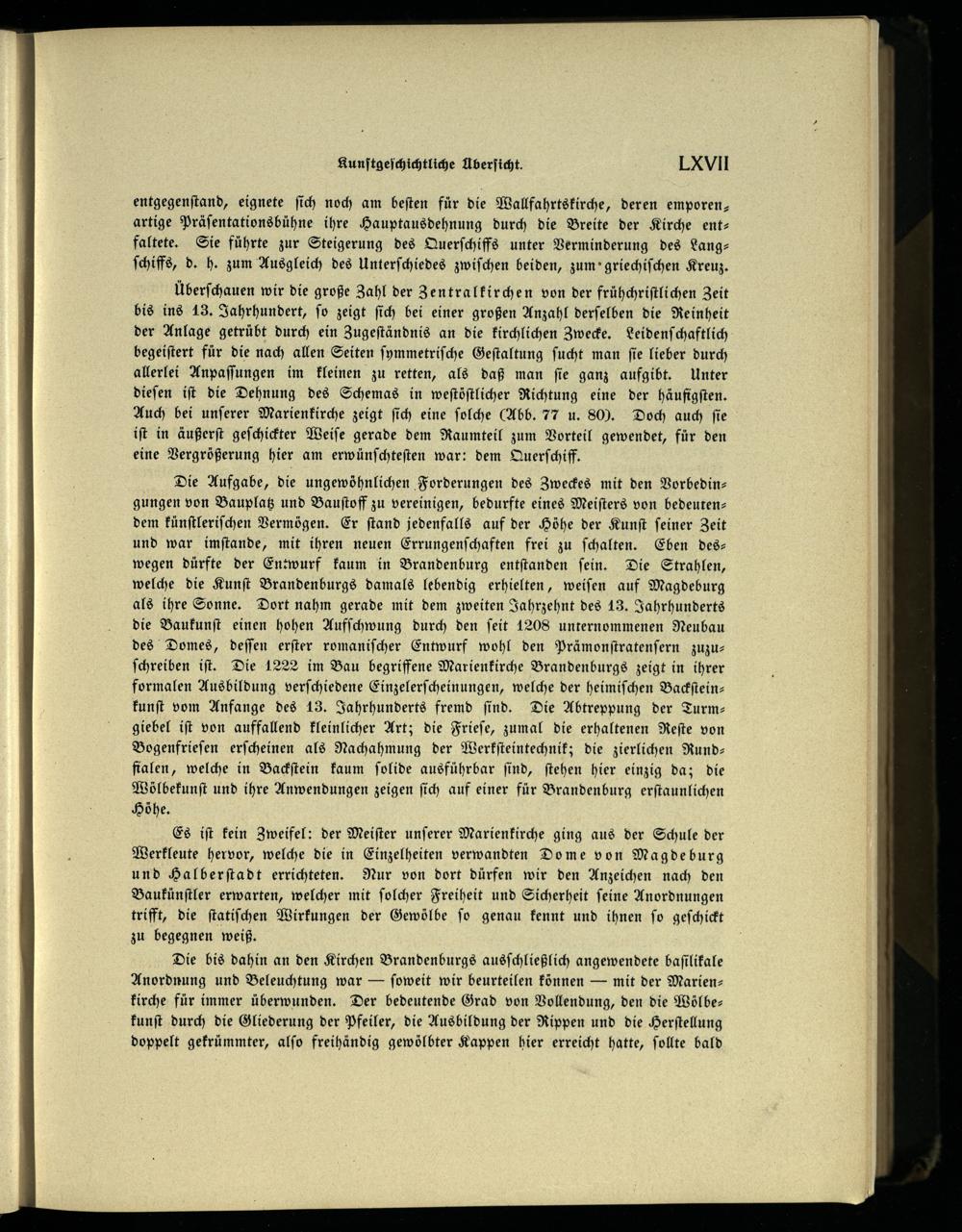 Die bis dahin an den Kirchen Brandenburgs ausſchließlich angewendete baſilikale Anordnung und Beleuchtung war— ſoweit wir beurteilen können— mit der Marienkirche für immer überwunden. Der bedeutende Grad von Vollendung, den die Wölbe— kunſt durch die Gliederung der Pfeiler, die Ausbildung der Rippen und die Herſtellung doppelt gekrümmter, alſo freihändig gewölbter Kappen hier erreicht hatte, ſollte bald