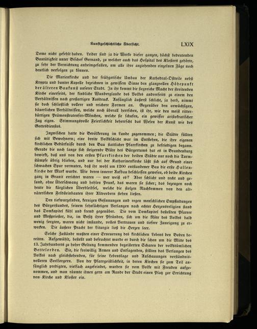 Inzwiſchen hatte die Bevölkerung im Lande zugenommen; die Städte füllten ſich mit Bewohnern; eine breite Volksſchicht war im Entſtehen, die ihre eigenen kirchlichen Bedürfniſſe durch den Bau ſtattlicher Pfarrkirchen zu befriedigen begann. Gerade die noch lange ſich ſteigernde Blüte des Bürgertums hat es in Brandenburg bewirkt, daß uns von den erſten Pfarrkirchen der beiden Städte nur noch die Turmſtümpfe übrig blieben, und nur bei der Katharinenkirche läßt ſich auf Grund einer ſchwachen Spur vermuten, daß ihr wohl um 1200 entſtandener Bau die erſte Hallenkirche der Mark wurde. Wie deren innerer Aufbau beſchloſſen geweſen, ob beide Kirchen ganz in Granit errichtet waren— wer weiß es? Aber ſchlicht und recht und geſund, ohne Überſchwang und hohlen Prunk, das waren ſie ſicher; das bezeugen noch heute die kärglichen Überbleibſel, welche die ſtolzen Nachkommen von den alt— väteriſchen Feldſteinbauten ihrer Altvordern ſtehen ließen.