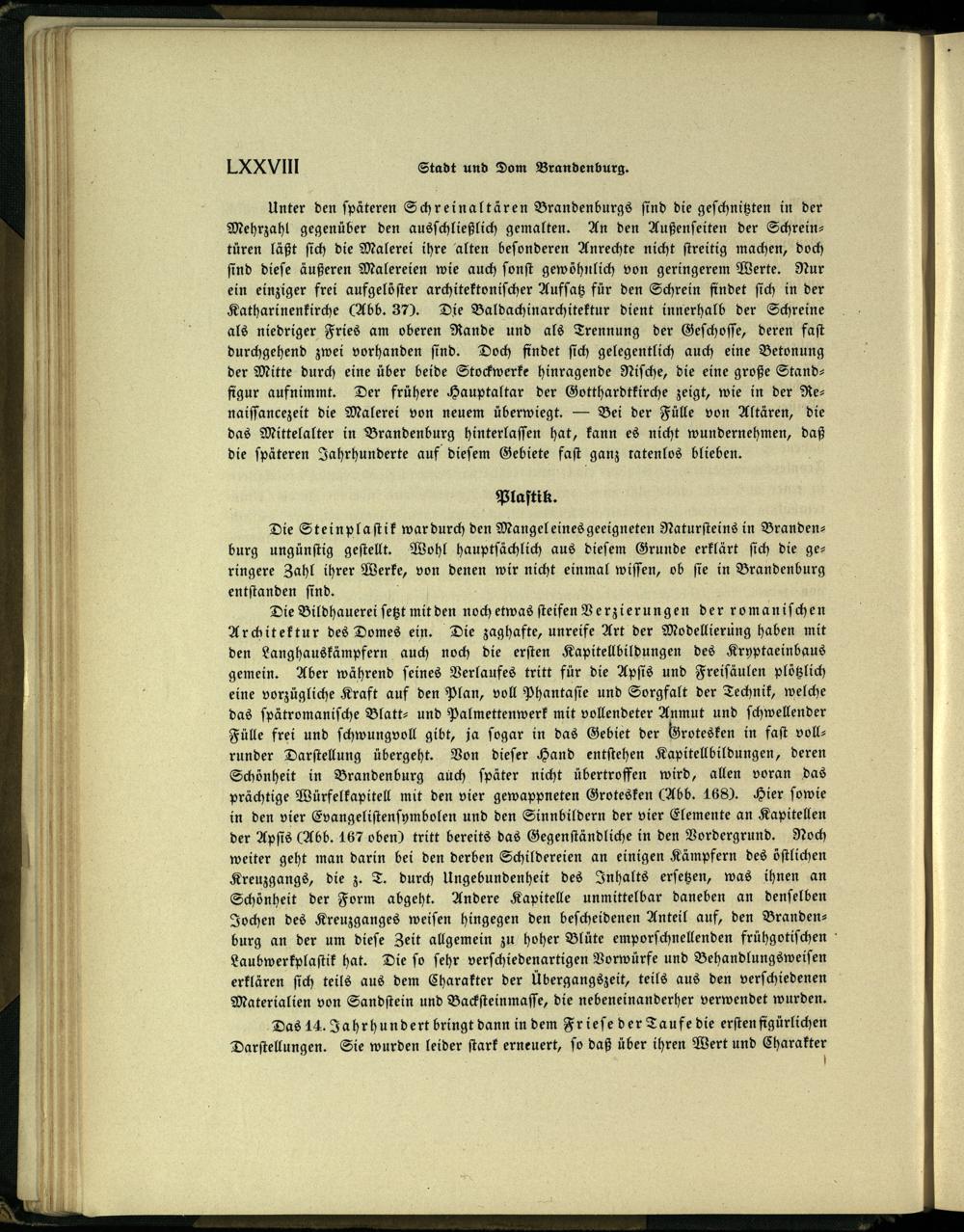 Die Bildhauerei ſetzt mit den noch etwas ſteifen Verzierungen der romaniſchen Architektur des Domes ein. Die zaghafte, unreife Art der Modellierung haben mit den Langhauskämpfern auch noch die erſten Kapitellbildungen des Kryptaeinbaus gemein. Aber während ſeines Verlaufes tritt für die Apſis und Freiſäulen plötzlich eine vorzügliche Kraft auf den Plan, voll Phantaſie und Sorgfalt der Technik, welche das ſpätromaniſche Blatt- und Palmettenwerk mit vollendeter Anmut und ſchwellender Fülle frei und ſchwungvoll gibt, ja ſogar in das Gebiet der Hrotesken in faſt vollrunder Darſtellung übergeht. Von dieſer Hand entſtehen Kapitellbildungen, deren Schönheit in Brandenburg auch ſpäter nicht übertroffen wird, allen voran das prächtige Würfelkapitell mit den vier gewappneten Grotesken(Abb. 168). Hier ſowie in den vier Evangeliſtenſymbolen und den Sinnbildern der vier Elemente an Kapitellen der Apſis(Abb. 167 oben) tritt bereits das Gegenſtändliche in den Vordergrund. Noch weiter geht man darin bei den derben Schildereien an einigen Kämpfern des öſtlichen Kreuzgangs, die z. T. durch Ungebundenheit des Inhalts erſetzen, was ihnen an Schönheit der Form abgeht. Andere Kapitelle unmittelbar daneben an denſelben Jochen des Kreuzganges weiſen hingegen den beſcheidenen Anteil auf, den Branden burg an der um dieſe Zeit allgemein zu hoher Blüte emporſchnellenden frühgotiſchen Laubwerkplaſtik hat. Die ſo ſehr verſchiedenartigen Vorwürfe und Behandlungsweiſen erklären ſich teils aus dem Charakter der Übergangszeit, teils aus den verſchiedenen Materialien von Sandſtein und Backſteinmaſſe, die nebeneinanderher verwendet wurden.