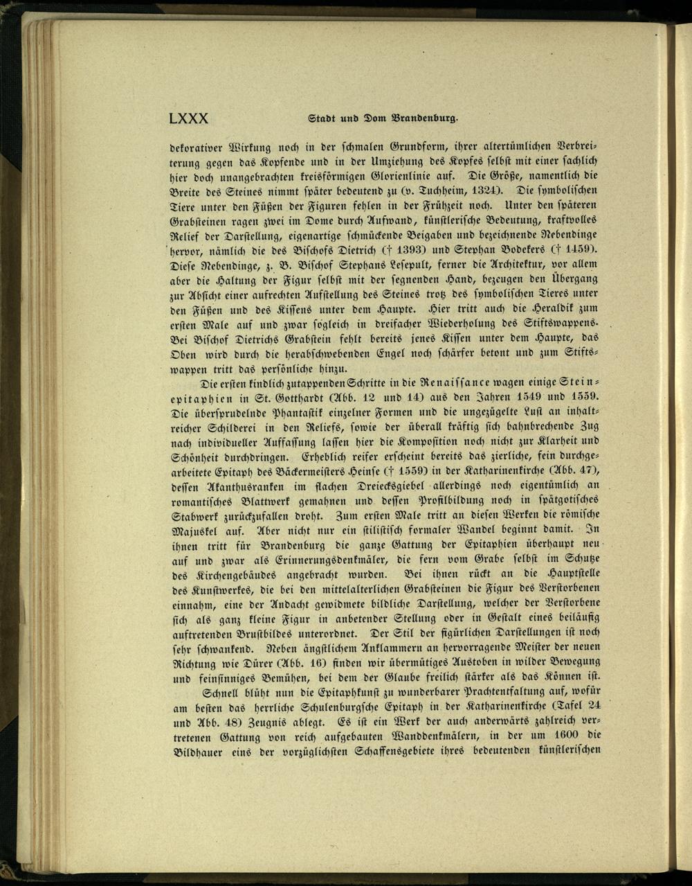 dekorativer Wirkung noch in der ſchmalen Grundform, ihrer altertümlichen Verbreiterung gegen das Kopfende und in der Umziehung des Kopfes ſelbſt mit einer ſachlich hier doch unangebrachten kreisförmigen Glorienlinie auf. Die Größe, namentlich die Breite des Steines nimmt ſpäter bedeutend zu(p. Tuchheim, 1324). Die ſymboliſchen Tiere unter den Füßen der Figuren fehlen in der Frühzeit noch. Unter den ſpäteren Grabſteinen ragen zwei im Dome durch Aufwand, künſtleriſche Bedeutung, kraftvolles Relief der Darſtellung, eigenartige ſchmückende Beigaben und bezeichnende Nebendinge hervor, nämlich die des Biſchofs Dietrich(F 1393) und Stephan Bodekers Ct 1459). Dieſe Nebendinge, z. B. Biſchof Stephans Leſepult, ferner die Architektur, vor allem aber die Haltung der Figur ſelbſt mit der ſegnenden Hand, bezeugen den Übergang zur Abſicht einer aufrechten Aufſtellung des Steines trotz des ſymboliſchen Tieres unter den Füßen und des Kiſſens unter dem Haupte. Hier tritt auch die Heraldik zum erſten Male auf und zwar ſogleich in dreifacher Wiederholung des Stiftswappens. Bei Biſchof Dietrichs Grabſtein fehlt bereits jenes Kiſſen unter dem Haupte, das Oben wird durch die herabſchwebenden Engel noch ſchärfer betont und zum Stiftswappen tritt das perſönliche hinzu.