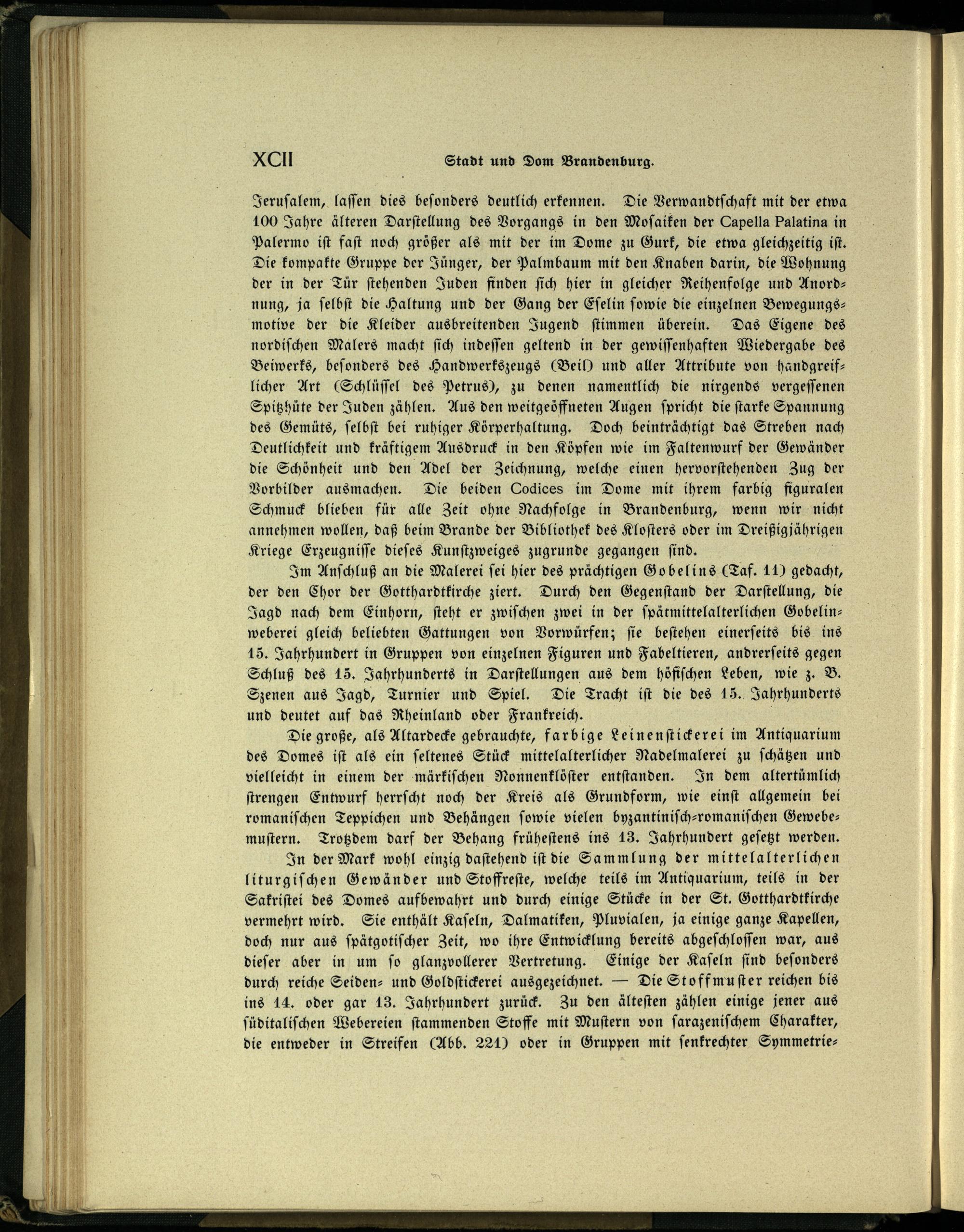Jeruſalem , laſſen dies beſonders deutlich erkennen. Die Verwandtſchaft mit der etwa 100 Jahre älteren Darſtellung des Vorgangs in den Moſaiken der Capella Palatina in Palermo iſt faſt noch größer als mit der im Dome zu Gurk, die etwa gleichzeitig iſt. Die kompakte Gruppe der Jünger, der Palmbaum mit den Knaben darin, die Wohnung der in der Tür ſtehenden Juden finden ſich hier in gleicher Reihenfolge und Anordnung, ja ſelbſt die Haltung und der Gang der Eſelin ſowie die einzelnen Bewegungsmotive der die Kleider ausbreitenden Jugend ſtimmen überein. Das Eigene des nordiſchen Malers macht ſich indeſſen geltend in der gewiſſenhaften Wiedergabe des Beiwerks, beſonders des Handwerkszeugs(Beil) und aller Attribute von handgreif— licher Art(Schlüſſel des Petrus ), zu denen namentlich die nirgends vergeſſenen Spitzhüte der Juden zählen. Aus den weitgeöffneten Augen ſpricht die ſtarke Spannung des Gemüts, ſelbſt bei ruhiger Körperhaltung. Doch beinträchtigt das Streben nach Deutlichkeit und kräftigem Ausdruck in den Köpfen wie im Faltenwurf der Gewänder die Schönheit und den Adel der Zeichnung, welche einen hervorſtehenden Zug der Vorbilder ausmachen. Die beiden Codices im Dome mit ihrem farbig figuralen Schmuck blieben für alle Zeit ohne Nachfolge in Brandenburg , wenn wir nicht annehmen wollen, daß beim Brande der Bibliothek des Kloſters oder im Dreißigjährigen Kriege Erzeugniſſe dieſes Kunſtzweiges zugrunde gegangen find.