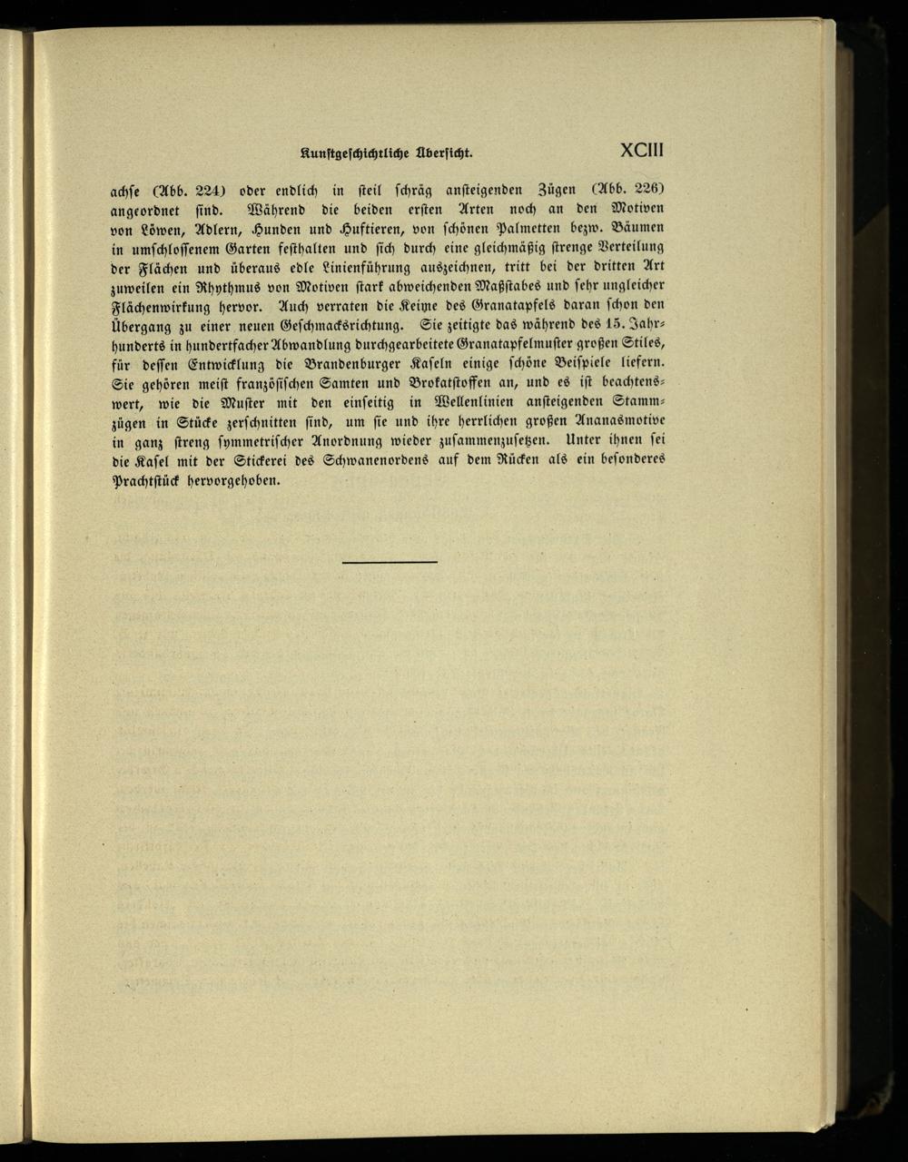 achſe(Abb. 224) oder endlich in ſteil ſchräg anfteigenden Zügen(Abb. 226) angeordnet ſind. Während die beiden erſten Arten noch an den Motiven von Löwen , Adlern, Hunden und Huftieren, von ſchönen Palmetten bezw. Bäumen in umſchloſſenem Garten feſthalten und ſich durch eine gleichmäßig ſtrenge Verteilung der Flächen und überaus edle Linienführung auszeichnen, tritt bei der dritten Art zuweilen ein Rhythmus von Motiven ſtark abweichenden Maßſtabes und ſehr ungleicher Flächenwirkung hervor. Auch verraten die Keime des Granatapfels daran ſchon den Übergang zu einer neuen Geſchmacksrichtung. Sie zeitigte das während des 15. Jahr— hunderts in hundertfacher Abwandlung durchgearbeitete Granatapfelmuſter großen Stiles, für deſſen Entwicklung die Brandenburger Kaſeln einige ſchöne Beiſpiele liefern. Sie gehören meiſt franzöſiſchen Samten und Brokatſtoffen an, und es iſt beachtenswert, wie die Muſter mit den einſeitig in Wellenlinien anſteigenden Stammzügen in Stücke zerſchnitten ſind, um ſie und ihre herrlichen großen Ananasmotive in ganz ſtreng ſymmetriſcher Anordnung wieder zuſammenzuſetzen. Unter ihnen ſei die Kaſel mit der Stickerei des Schwanenordens auf dem Rücken als ein beſonderes Prachtſtück hervorgehoben.