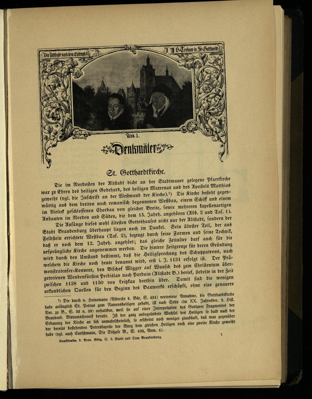 Die Anfänge dieſes wohl älteſten Gotteshauſes nicht nur der Altſtadt, ſondern der Stadt Brandenburg überhaupt liegen noch im Dunkel. Sein älteſter Teil, der aus Feldſtein errichtete Weſtbau(Taf. 2), bezeugt durch ſeine Formen und ſeine Technik, daß er noch dem 12. Jahrh. angehört; das gleiche Zeitalter darf auch für die urſprüngliche Kirche angenommen werden. Die hintere Zeitgrenze für deren Gründung wird durch den Umſtand beſtimmt, daß die Heiligſprechung des Schutzpatrons, nach welchem die Kirche noch heute benannt wird, erſt i. J. 1434 erfolgt iſt. Der Prä monſtratenſer⸗Konvent , den Biſchof Wigger auf Wunſch des zum Chriſtentum über