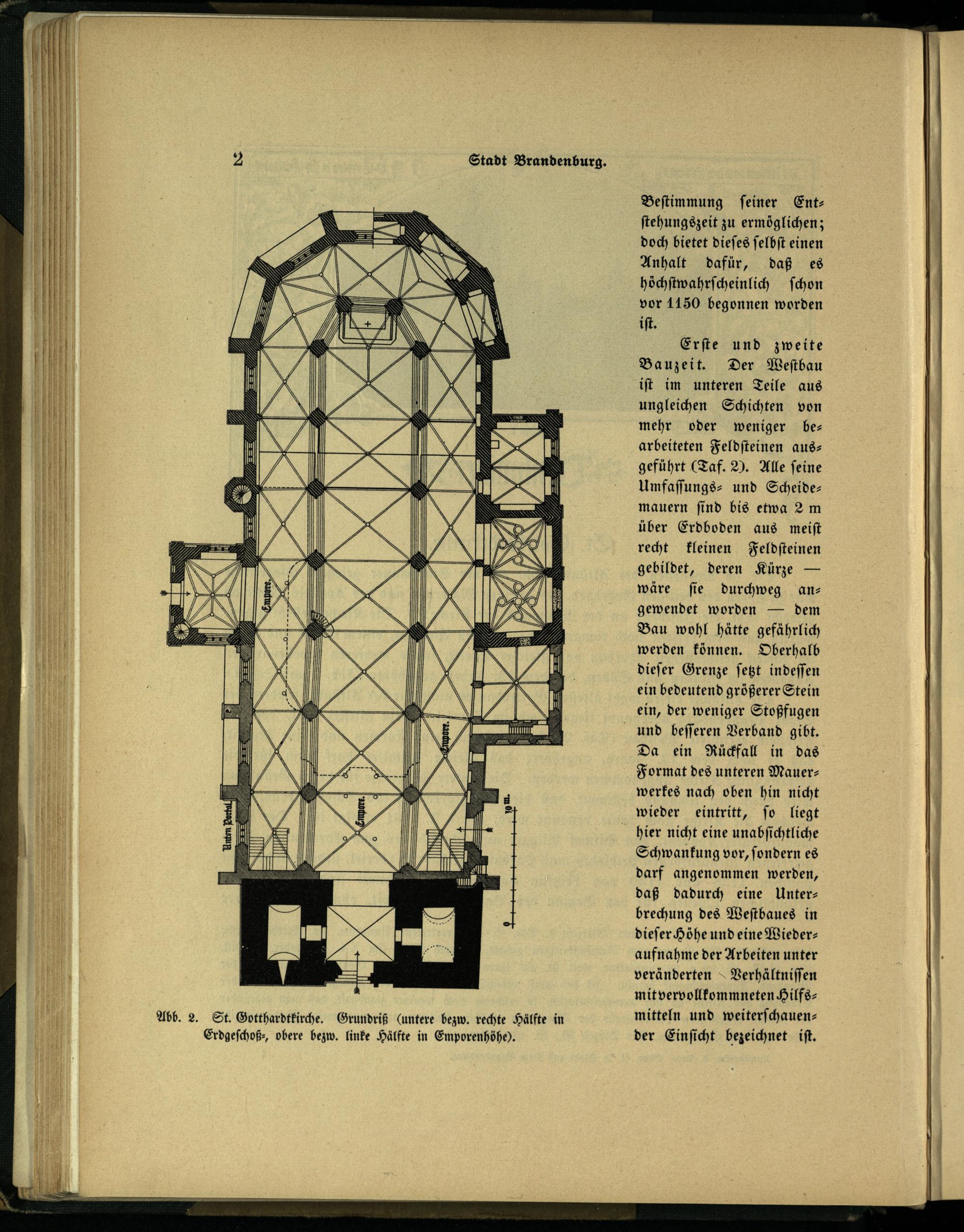 Abb. 2. St. Gotthardtkirche . Grundriß(untere bezw. rechte Hälfte in Erdgeſchoß⸗ obere bezw. linke Hälfte in Emporenhöhe).