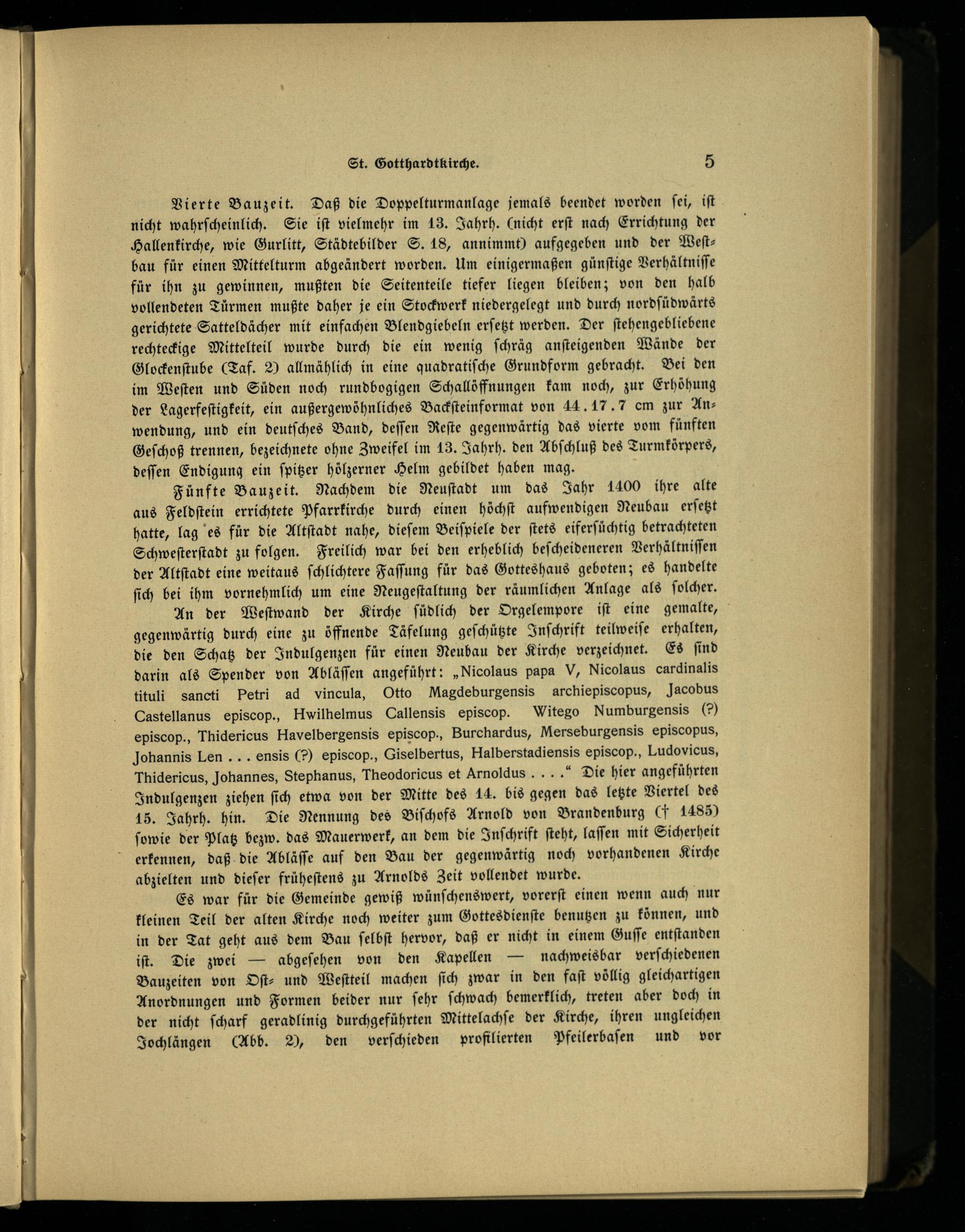 An der Weſtwand der Kirche ſüdlich der Orgelempore iſt eine gemalte, gegenwärtig durch eine zu öffnende Täfelung geſchützte Inſchrift teilweiſe erhalten, die den Schatz der Indulgenzen für einen Neubau der Kirche verzeichnet. Es ſind darin als Spender von Abläſſen angeführt:„Nicolaus papa V, Nicolaus cardinalis tituli sancti Petri ad vincula, Otto Magdeburgensis archiepiscopus, Jacobus Castellanus episcop., Hwilhelmus Callensis episcop. Witego Numburgensis(9) episcop., Thidericus Havelbergensis episcop., Burchardus, Merseburgensis episcopus, Johannis Len... ensis() episcop., Giselbertus, Halberstadiensis episcop., Ludovicus, Thidericus, Johannes, Stephanus, Theodoricus et Arnoldus... Die hier angeführten Indulgenzen ziehen ſich etwa von der Mitte des 14. bis gegen das letzte Viertel des 15. Jahrh. hin. Die Nennung des Biſchofs Arnold von Brandenburg(F 1485) ſowie der Platz bezw. das Mauerwerk, an dem die Inſchrift ſteht, laſſen mit Sicherheit erkennen, daß die Abläſſe auf den Bau der gegenwärtig noch vorhandenen Kirche abzielten und dieſer früheſtens zu Arnolds Zeit vollendet wurde.