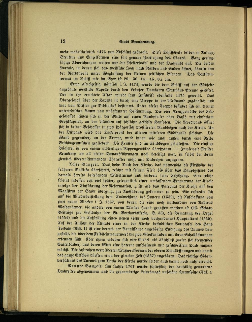 Achte Bauzeit. Das hohe Dach der Kirche, das notwendig die Firſthöhe der früheren Baſilika überſchritt, reichte mit ſeinem Firſt bis über das Hauptgeſims des damals bereits beſtehenden Mittelturms und forderte ſeine Erhöhung. Eine ſolche ſcheint indeſſen erſt viel ſpäter, gelegentlich einer umfaſſenden Erneuerung der Kirche infolge der Einführung der Reformation, z. Zt. als das Patronat der Kirche auf den Magiſtrat der Stadt überging, zur Ausführung gekommen zu ſein. Sie erſtreckte ſich auf die Wiederherſtellung bzw. Ausweißung des Innern(1559), die Anſchaffung von zwei neuen Glocken i. J. 1557, von denen die eine noch vorhandene von Andreas Moldenhewer, die andere von einem Meiſter Jacob gegoſſen worden iſt(W. Schott, Beiträge zur Geſchichte der St. Gotthardtkirche , S. 53), die Bemalung der Orgel (1554) und die Aufſtellung eines neuen(jetzt noch vorhandenen) Hauptaltars(1559). Auf der Anſicht der Altſtadt einer in der Kirche befindlichen Votivtafel des Hans Trebaw(Abb. H iſt eine bereits der Renaiſſance angehörige Endigung des Turmes dar— geſtellt, die über dem Feldſteinmauerwerk die zwei Glockenſtuben mit ihren Schallöffnungen erkennen läßt. Über ihnen erheben ſich vier Giebel als Abſchluß zweier ſich kreuzender Satteldächer, aus deren Mitte eine Laterne anſcheinend mit geſchweiftem Dach emporwächſt. Die faſt rohen verwilderten Maßwerkformen der oberen Schallöffnungen und damit das ganze Geſchoß dürften etwa der gleichen Zeit(1557) angehören. Das richtige Höhen verhältnis des Turmes zum Dache der Kirche wurde leider auch damit noch nicht erreicht.