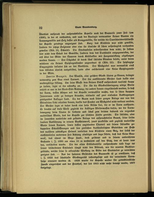 Zweite Bauzeit. Der Wunſch, eine größere Glocke läuten zu können, drängte notwendig zum Bau eines Turmes. Der ihn ausführende Meiſter fand dafür eine muſtergültige Löſung. Um ſeine Maſſe dem kleinen Schiff entſprechend tunlichſt knapp zu halten, legte er ihn achteckig an. Die für die Glockenſchwingung nötige Breite erhielt er nur in der Nord⸗Süd⸗Richtung; die andere konnte eingeſchränkt werden, ſo daß der Turm, deſſen Körper mit der Kapelle verwachſen mußte, den ſo ſchon knappen Innenraum nicht zu beengen brauchte, vielmehr auf zwei einfachen Auskragungen genügendes Auflager fand. Da der Raum nach ſeiner ganzen Anlage nur von den Stirnſeiten Licht erhalten konnte, durfte das Fenſter am Weſtgiebel nicht verbaut werden. Der Meiſter legte es daher durch eine hohe Niſche frei, die er im Turm ausſparte. Er brachte auf dieſe Weiſe zugleich die kräftigen Pfeilermaſſen dahin, wo die Turmbewegung beim Läuten ſie forderte und ſchuf zum dritten dadurch ein reizvolles maleriſches Motiv, das der Kapelle zur höchſten Zierde gereicht. Die ſchlichte, aber im Innerſten natürliche und geſunde Anlage des anſpruchsloſen Baues, ſeine ſolide ſaubere Ausführung in reinem Backſteinwerk, jenes praktiſche und zugleich maleriſche Motiv ſeines Turmes, ſowie deſſen anziehender Oberteil mit ſeinen ſchlanken gekuppelten Schallöffnungen und den zierlichen krabbenbeſetzten Giebelchen am Fuße des maſſiven achteckigen Helmes verleihen dem Kirchlein einen Reiz, der ſelbſt der rückſichtsloſen modernen Zeit Achtung abnötigte und dazu führte, daß das kleine Bauwerk, das etwas im Wege ſtand, doch geſchont und in ſeinem unberührten Beſtande i. J. 1892 um etwa 11 m weſtwärts auf den Platz, den es heute inne hat, verſchoben wurde. Die der alten Erdbodenhöhe entſprechende tiefe Lage tut ſeiner beſcheidenen Schönheit längſt nicht den Abbruch, wie die neueren Nachbargebäude, welche ſeine ſo erfreuliche Wirkung im Bilde des Stadtteiles zu vernichten geeignet ſind.— Aus der ſpäteren Geſchichte des Bauwerks iſt zu erwähnen, daß i. J. 1833 das ſchadhafte Glockengerüͤſt inſtandgeſetzt und die verwitterte Turmſpitze erneuert worden iſt. 1858 wurde die Kapelle wieder für gottesdienſtliche Zwecke eingerichtet und der Friedhof, der ſeit 1815 nicht mehr benutzt wurde, 1877 freigelegt.