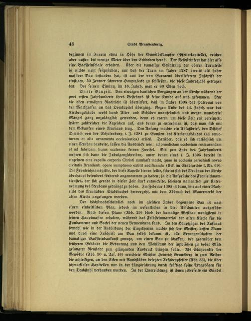 Der höchſtwahrſcheinlich noch im gleichen Jahre begonnene Bau iſt nach einem einheitlichen Plan, jedoch im weſentlichen in drei Abſchnitten ausgeführt worden. Nach dieſem Plane(Abb. 29) blieb der damalige Weſtbau wenigſtens in ſeinen Hauptmaſſen erhalten, während das Feldſteinmaterial der alten Kirche für die Fundamente und Sockel der neuen Verwendung fand. In den Hauptzügen des Aufbaus ſowohl wie in der Ausbildung der Einzelheiten machte ſich der Meiſter, deſſen Name uns durch eine Inſchrift am Bau ſelbſt bekannt iſt, alle Errungenſchaften der damaligen Backſteinbaukunſt zunutze, um einen Bau zu ſchaffen, der gegenüber dem früheren Gebäude die Bedeutung und den Wohlſtand der inzwiſchen zu hoher Blüte gelangten Neuſtadt zum glänzenden Ausdruck bringen ſollte. Als Stützpunkte der Gewölbe(Abb. 30 u. Taf. 16) errichtete Meiſter Heinrich Brunsberg in zwei Reihen die achteckigen, an den Ecken mit Rundſtäben beſetzten Arkadenpfeiler(Abb. 33), die über ſchmuckloſen Kapitellen nur in der Längsrichtung durch kräftige ſpitze Tragebögen für den Dachſtuhl verbunden wurden. In der Querrichtung iſt ihnen jederſeits ein Bündel