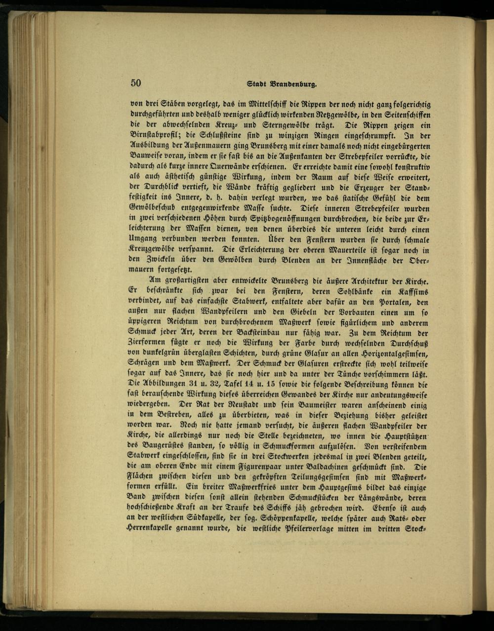 von drei Stäben vorgelegt, das im Mittelſchiff die Rippen der noch nicht ganz folgerichtig durchgeführten und deshalb weniger glücklich wirkenden Netzgewölbe, in den Seitenſchiffen die der abwechſelnden Kreuz- und Sterngewölbe trägt. Die Rippen zeigen ein Birnſtabprofil; die Schlußſteine ſind zu winzigen Ringen eingeſchrumpft. In der Ausbildung der Außenmauern ging Brunsberg mit einer damals noch nicht eingebürgerten Bauweiſe voran, indem er ſie faſt bis an die Außenkanten der Strebepfeiler vorrückte, die dadurch als kurze innere Querwände erſchienen. Er erreichte damit eine ſowohl konſtruktiv als auch äſthetiſch günſtige Wirkung, indem der Raum auf dieſe Weiſe erweitert, der Durchblick vertieft, die Wände kräftig gegliedert und die Erzeuger der Standfeſtigkeit ins Innere, d. h. dahin verlegt wurden, wo das ſtatiſche Gefühl die dem Gewölbeſchub entgegenwirkende Maſſe ſuchte. Dieſe inneren Strebepfeiler wurden in zwei verſchiedenen Höhen durch Spitzbogenöffnungen durchbrochen, die beide zur Erz leichterung der Maſſen dienen, von denen überdies die unteren leicht durch einen Umgang verbunden werden konnten. Über den Fenſtern wurden ſie durch ſchmale Kreuzgewölbe verſpannt. Die Erleichterung der oberen Mauerteile iſt ſogar noch in den Zwickeln über den Gewölben durch Blenden an der Innenfläche der Ober— mauern fortgeſetzt.