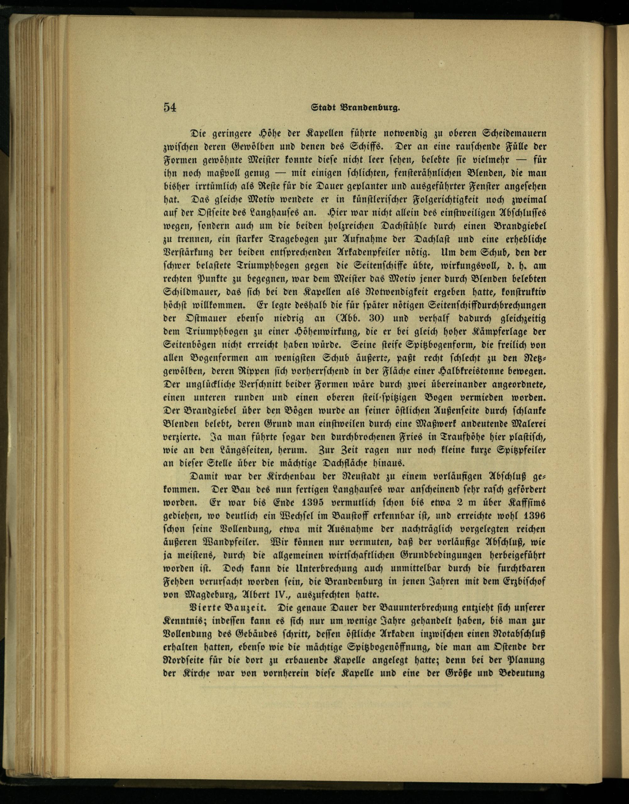 Damit war der Kirchenbau der Neuſtadt zu einem vorläufigen Abſchluß gekommen. Der Bau des nun fertigen Langhauſes war anſcheinend ſehr raſch gefördert worden. Er war bis Ende 1395 vermutlich ſchon bis etwa 2 m über Kaffſims gediehen, wo deutlich ein Wechſel im Bauſtoff erkennbar iſt, und erreichte wohl 1396 ſchon ſeine Vollendung, etwa mit Ausnahme der nachträglich vorgelegten reichen äußeren Wandpfeiler. Wir können nur vermuten, daß der vorläufige Abſchluß, wie ja meiſtens, durch die allgemeinen wirtſchaftlichen Grundbedingungen herbeigeführt worden iſt. Doch kann die Unterbrechung auch unmittelbar durch die furchtbaren Fehden verurſacht worden ſein, die Brandenburg in jenen Jahren mit dem Erzbiſchof von Magdeburg , Albert IV., auszufechten hatte.;
