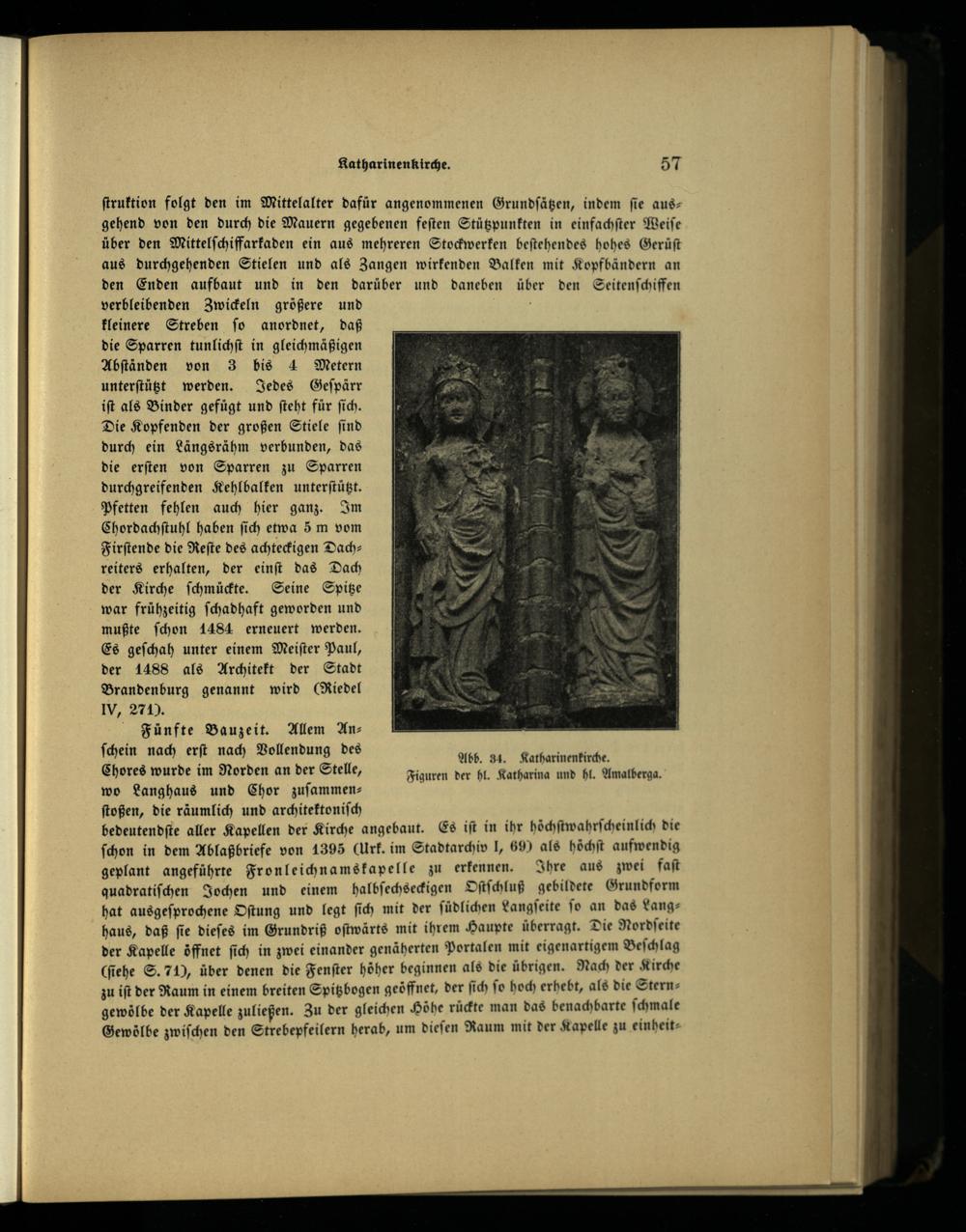 Fünfte Bauzeit. Allem Anſchein nach erſt nach Vollendung des Abb. 31. Katharinenkirche. Chores wurde im Norden an der Stelle, Figuren der hl. Katharina und hl. Amalberga. wo Langhaus und Chor zuſammenſtoßen, die räumlich und architektoniſch bedeutendſte aller Kapellen der Kirche angebaut. Es iſt in ihr höchſtwahrſcheinlich die ſchon in dem Ablaßbriefe von 1395(Urk. im Stadtarchiv I, 69) als höchſt aufwendig geplant angeführte Fronleichnamskapelle zu erkennen. Ihre aus zwei faſt quadratiſchen Jochen und einem halbſechseckigen Oſtſchluß gebildete Grundform hat ausgeſprochene Oſtung und legt ſich mit der ſüdlichen Langſeite ſo an das Langhaus, daß ſie dieſes im Grundriß oſtwärts mit ihrem Haupte überragt. Die Nordſeite der Kapelle öffnet ſich in zwei einander genäherten Portalen mit eigenartigem Beſchlag (ſiehe S. 71), über denen die Fenſter höher beginnen als die übrigen. Nach der Kirche zu iſt der Raum in einem breiten Spitzbogen geöffnet, der ſich ſo hoch erhebt, als die Sterngewölbe der Kapelle zuließen. Zu der gleichen Höhe rückte man das benachbarte ſchmale Gewölbe zwiſchen den Strebepfeilern herab, um dieſen Raum mit der Kapelle zu einheit