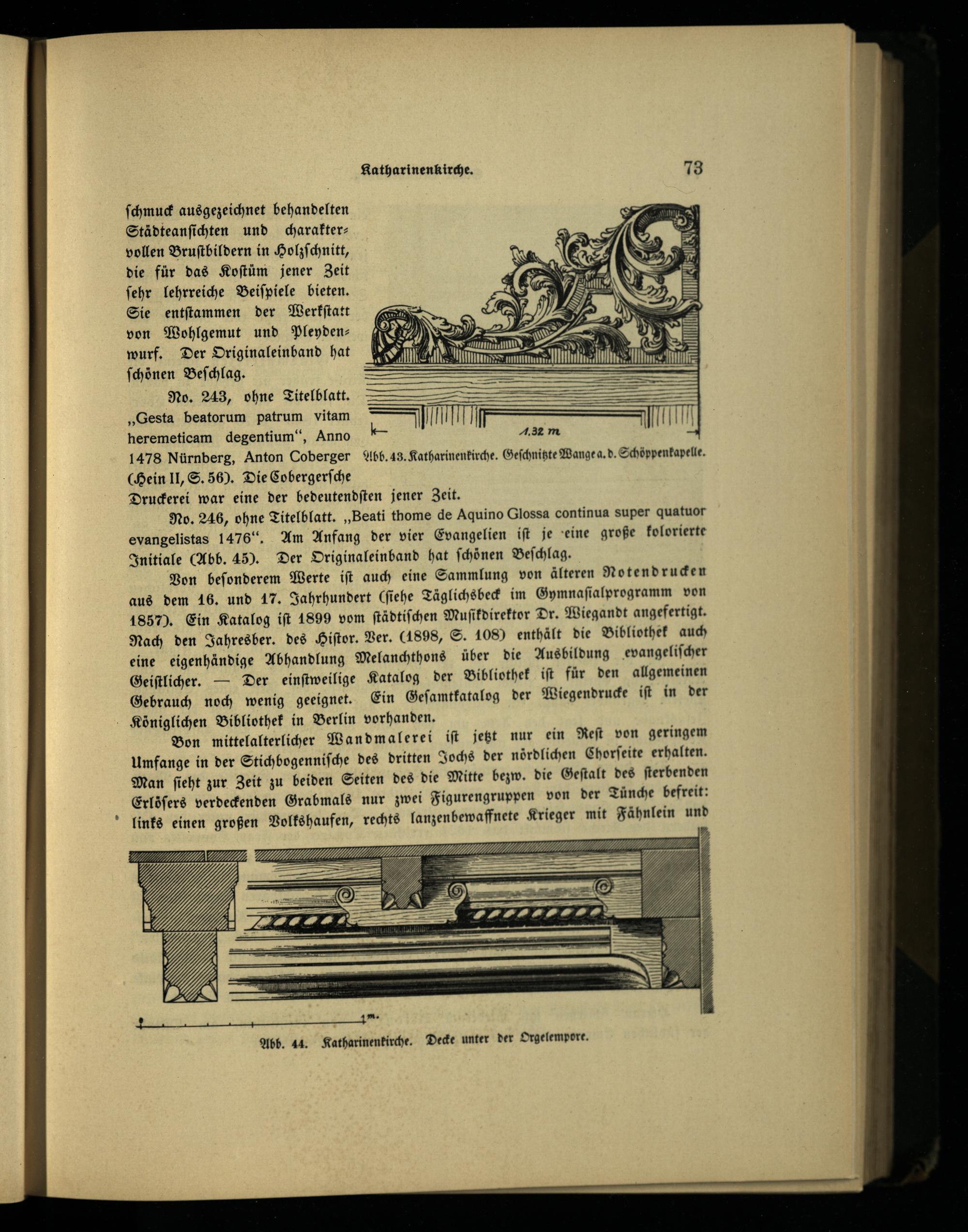 No. 243, ohne Titelblatt.;= „Gesta beatorum patrum vitam heremeticam degentium“, Anno 1478 Nürnberg, Anton Coberger Abb. 43. Katharinenkirche. Geſchnitzte Wange a. d. Schöppenkapelle. (Bein Il, S. 56). Die Cobergerſche Druckerei war eine der bedeutendſten jener Zeit.