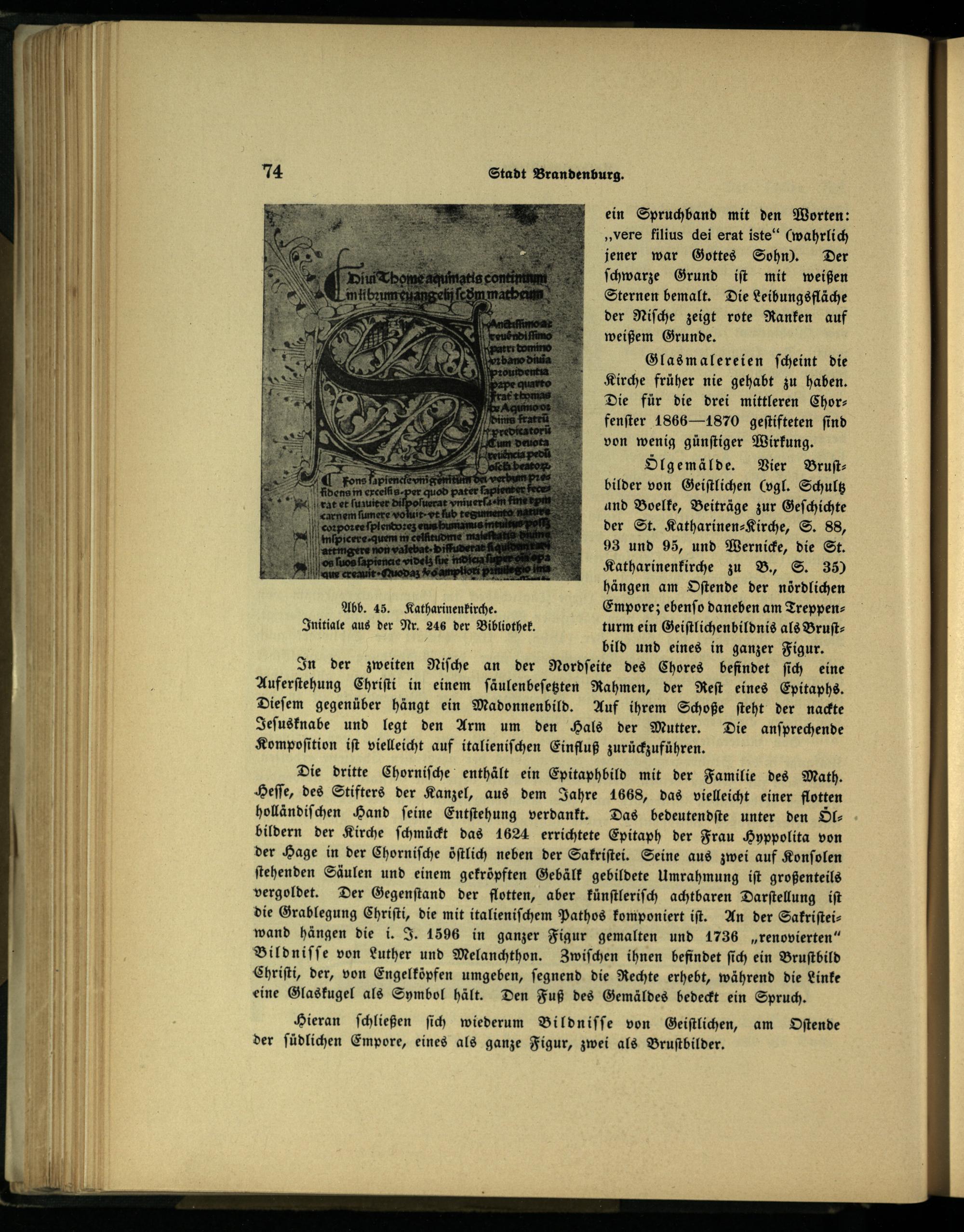 Initiale aus der Nr. 246 der Bibliothek. turm ein Geiſtlichenbildnis als Bruſt; bild und eines in ganzer Figur. In der zweiten Niſche an der Nordſeite des Chores befindet ſich eine Auferſtehung Chriſti in einem ſäulenbeſetzten Rahmen, der Reſt eines Epitaphs. Dieſem gegenüber hängt ein Madonnenbild. Auf ihrem Schoße ſteht der nackte Jeſusknabe und legt den Arm um den Hals der Mutter. Die anſprechende Kompoſition iſt vielleicht auf italieniſchen Einfluß zurückzuführen.