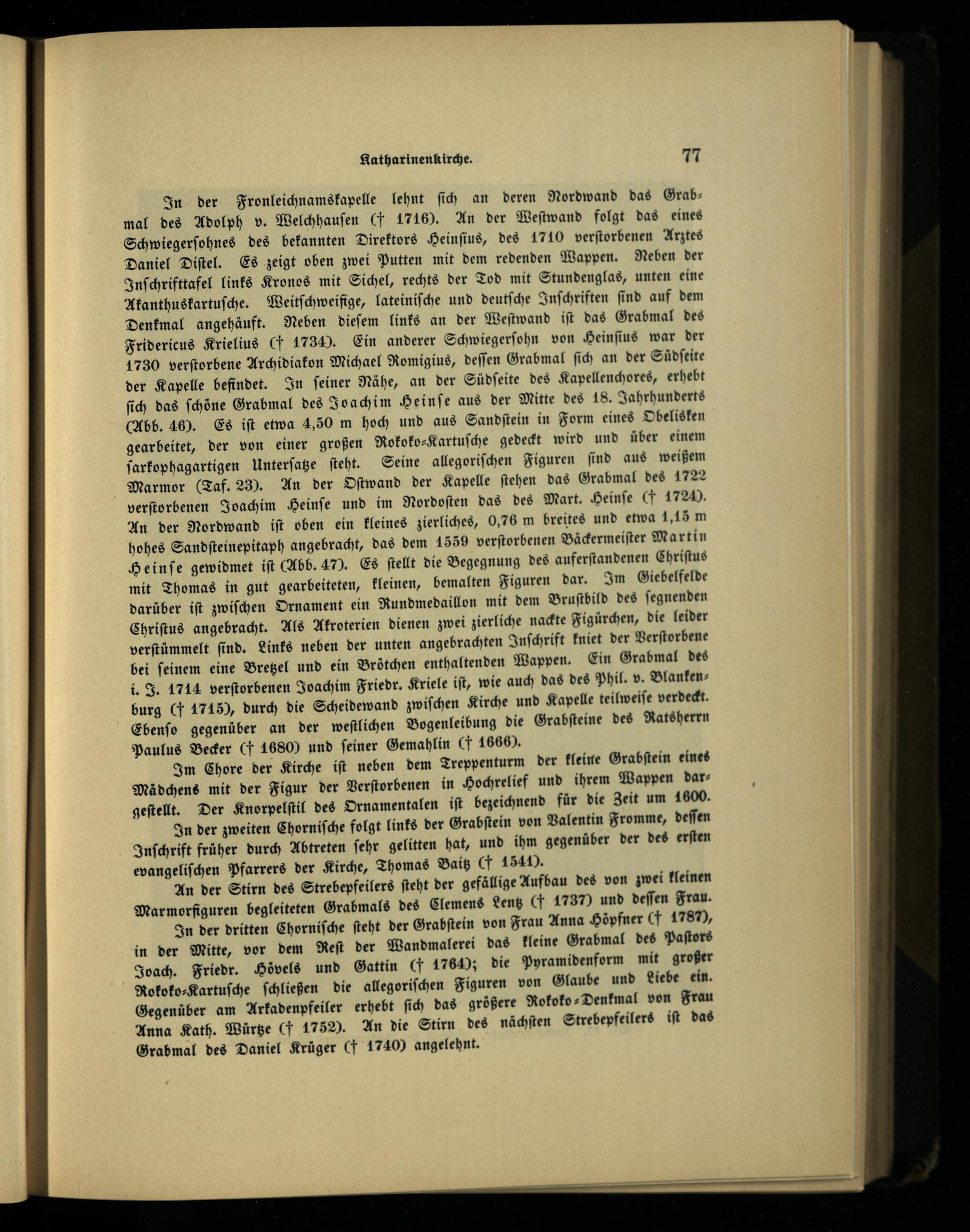 In der Fronleichnamskapelle lehnt ſich an deren Nordwand das Grabmal des Adolph v. Welchhauſen(F 1716). An der Weſtwand folgt das eines Schwiegerſohnes des bekannten Direktors Heinſius, des 1710 verſtorbenen Arztes Daniel Diſtel. Es zeigt oben zwei Putten mit dem redenden Wappen. Neben der Inſchrifttafel links Kronos mit Sichel, rechts der Tod mit Stundenglas, unten eine Akanthuskartuſche. Weitſchweifige, lateiniſche und deutſche Inſchriften ſind auf dem Denkmal angehäuft. Neben dieſem links an der Weſtwand iſt das Grabmal des Fridericus Krielius( 1734). Ein anderer Schwiegerſohn von Heinſius war der 1730 verſtorbene Archidiakon Michael Romigius, deſſen Grabmal ſich an der Sübdfeite der Kapelle befindet. In feiner Nähe, an der Südſeite des Kapellenchores, erhebt ſich das ſchöne Grabmal des Joachim Heinſe aus der Mitte des 18. Jahrhunderts (Abb. 46). Es iſt etwa 4,50 m hoch und aus Sandſtein in Form eines Obelisken gearbeitet, der von einer großen Rokoko⸗-Kartuſche gedeckt wird und über einem ſarkophagartigen Unterſatze ſteht. Seine allegoriſchen Figuren find aus weißem Marmor(Taf. 23). An der Oſtwand der Kapelle ſtehen das Grabmal des 1722 verſtorbenen Joachim Heinſe und im Nordoſten das des Mart. Heinſe(6 1724). An der Nordwand iſt oben ein kleines zierliches, o, 75 m breites und etwa 1,15 m hohes Sandſteinepitaph angebracht, das dem 1559 verſtorbenen Bäckermeiſter Martin Heinſe gewidmet iſt(Abb. 477. Es ſtellt die Begegnung des auferſtandenen Chriſtus mit Thomas in gut gearbeiteten, kleinen, bemalten Figuren dar. Im Giebelfelde darüber iſt zwiſchen Ornament ein Rundmedaillon mit dem Bruſtbild des ſegnenden Chriſtus angebracht. Als Akroterien dienen zwei zierliche nackte Figürchen, die leider verſtümmelt ſind. Links neben der unten angebrachten Inſchrift kniet der Verſtorbene bei ſeinem eine Bretzel und ein Brötchen enthaltenden Wappen. Ein Grabmal des i. J. 1714 verſtorbenen Joachim Friedr. Kriele iſt, wie auch das des Phil. v. Blankenburg C 1715), durch die Scheidewand zwiſchen Kirche und Kapelle teilweiſe verdeckt. Ebenſo gegenüber an der weſtlichen Bogenleibung die Grabſteine des Ratsherrn Paulus Becker(+ 1680) und feiner Gemahlin(S 1666.