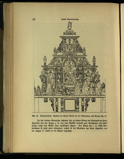In der vierten Chorniſche befinden ſich zu beiden Seiten des Epitaphs der Frau Hypolita von der Hagen z. T. von dem Geſtühl verdeckt zwei Grabſteine; der linksſeitige trägt das Relief einer weiblichen Figur. Der Name der i. J. 1588 Verſtorbenen iſt nicht mehr erkennbar; rechts iſt der Grabſtein der Frau Hypolita von der Hagen(f 1620) in die Wand eingefügt.
