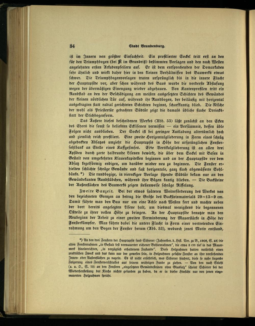 Zweite Bauzeit. Bei der etwas ſpäteren Weiterförderung des Werkes von den bezeichneten Grenzen an betrug die Größe des Backſteinmaterials 29139 em. Damit führte man den Bau nur um eine Achſe nach Weſten fort und machte neben der dort bereits angelegten Liſene halt, um diesmal wenigſtens die begonnenen Oſtteile zu ihrer vollen Höhe zu bringen. An der Hauptapſide benutzte man den Neubeginn der Arbeit zu einer zweiten Verminderung der Mauerſtärke in Höhe der Fenſterkämpfer. Man führte dabei die untere Flucht in Form einer vortretenden Einrahmung um den Bogen der Fenſter herum(Abb. 53), wodurch jenes Motiv entſtand,