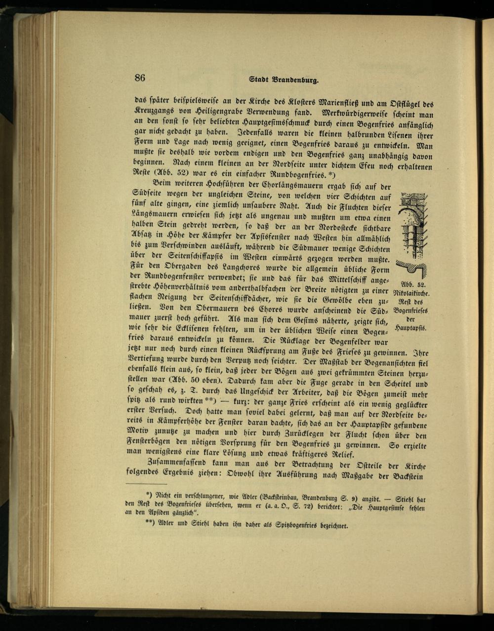 das ſpäter beiſpielsweiſe an der Kirche des Kloſters Marienfließ und am Oſtflügel des Kreuzgangs von Heiligengrabe Verwendung fand. Merkwürdigerweiſe ſcheint man an den ſonſt ſo ſehr beliebten Hauptgeſimsſchmuck durch einen Bogenfries anfänglich gar nicht gedacht zu haben. Jedenfalls waren die kleinen halbrunden Liſenen ihrer Form und Lage nach wenig geeignet, einen Bogenfries daraus zu entwickeln. Man mußte ſie deshalb wie vordem endigen und den Bogenfries ganz unabhängig davon beginnen. Nach einem kleinen an der Nordſeite unter dichtem Efeu noch erhaltenen Reſte(Abb. 52) war es ein einfacher Rundbogenfries.*)