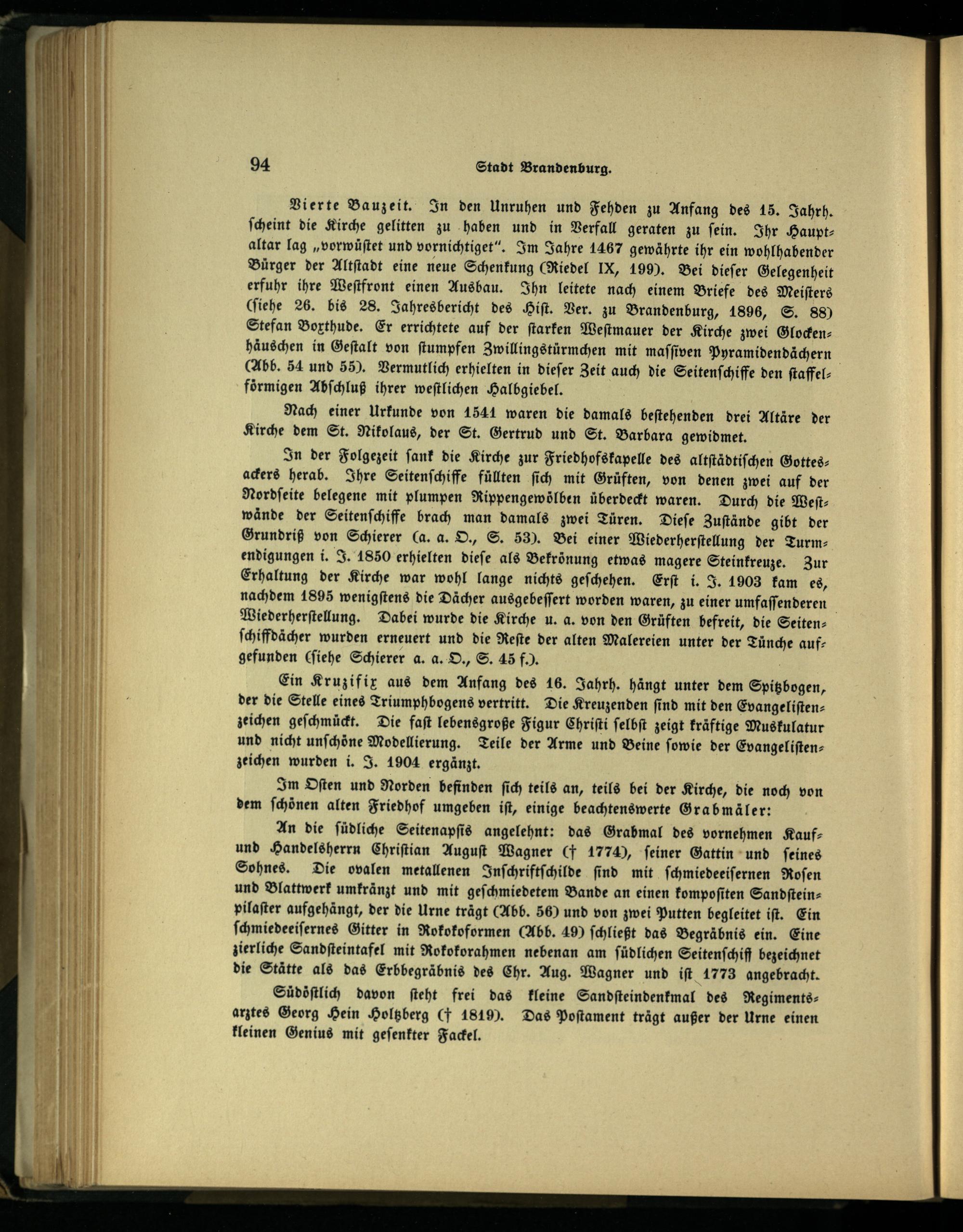 Bierte Bauzeit. In den Unruhen und Fehden zu Anfang des 15. Jahrh. ſcheint die Kirche gelitten zu haben und in Verfall geraten zu ſein. Ihr Hauptaltar lag„vorwuſtet und vornichtiget“. Im Jahre 1467 gewährte ihr ein wohlhabender Bürger der Altſtadt eine neue Schenkung(Riedel IX, 195). Bei dieſer Gelegenheit erfuhr ihre Weſtfront einen Ausbau. Ihn leitete nach einem Briefe des Meiſters (ſiehe 25. bis 28. Jahresbericht des Hiſt. Ver. zu Brandenburg , 1896, S. 88) Stefan Boxthude. Er errichtete auf der ſtarken Weſtmauer der Kirche zwei Glockenhäuschen in Geſtalt von ſtumpfen Zwillingstürmchen mit maſſiven Pyramidendächern. (Abb. 54 und 55). Vermutlich erhielten in dieſer Zeit auch die Seitenſchiffe den ſtaffelförmigen Abſchluß ihrer weſtlichen Halbgiebel.