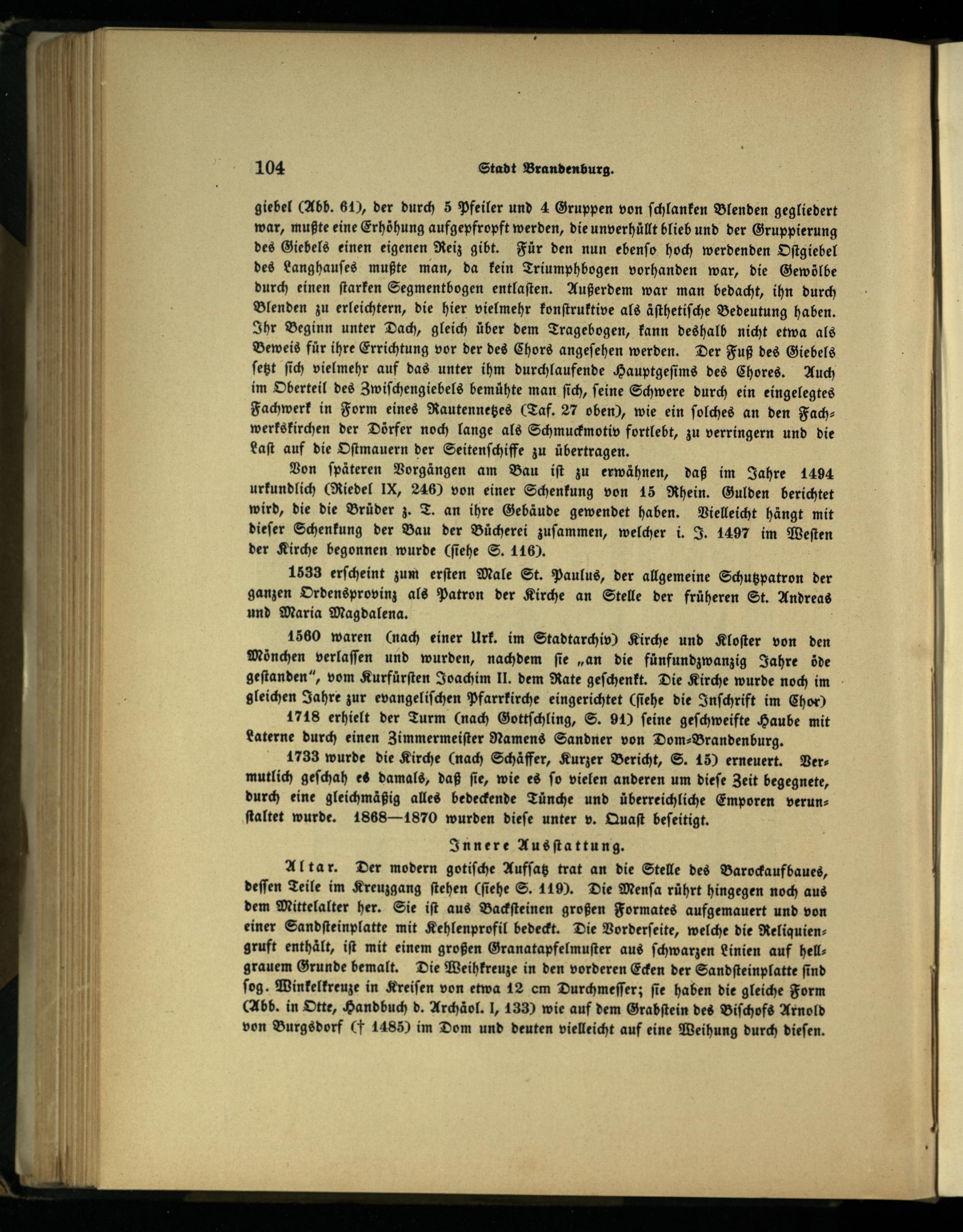 Von ſpäteren Vorgängen am Bau iſt zu erwähnen, daß im Jahre 1494 urkundlich(Riedel IX, 246) von einer Schenkung von 15 Rhein . Gulden berichtet wird, die die Brüder z. T. an ihre Gebäude gewendet haben. Vielleicht hängt mit dieſer Schenkung der Bau der Bücherei zuſammen, welcher i. J. 1497 im Weſten der Kirche begonnen wurde(ſiehe S. 116).