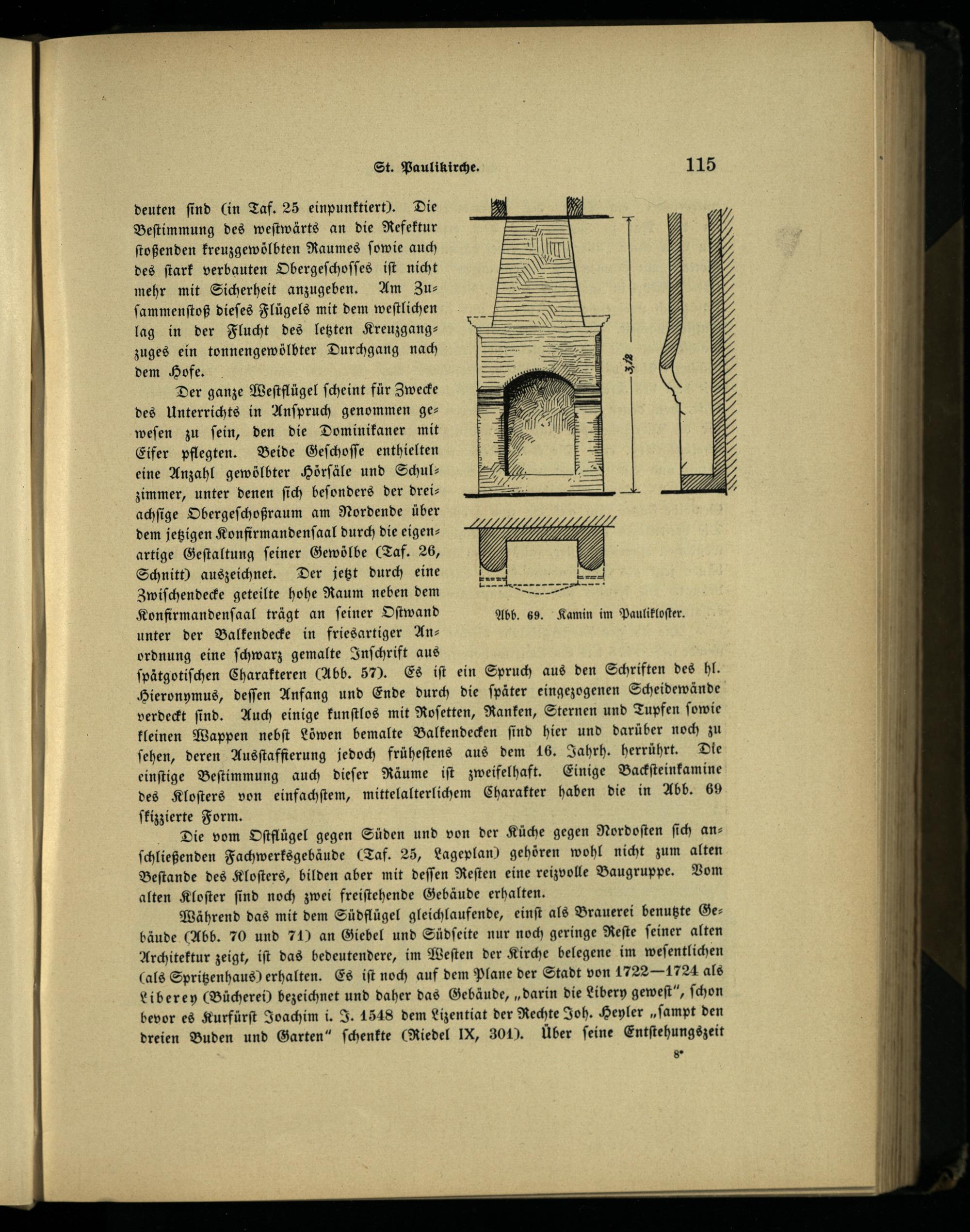Konfirmandenſaal trägt an ſeiner Oſtwand Abb. 69. Kamin im Paulikloſter. unter der Balkendecke in friesartiger Anz