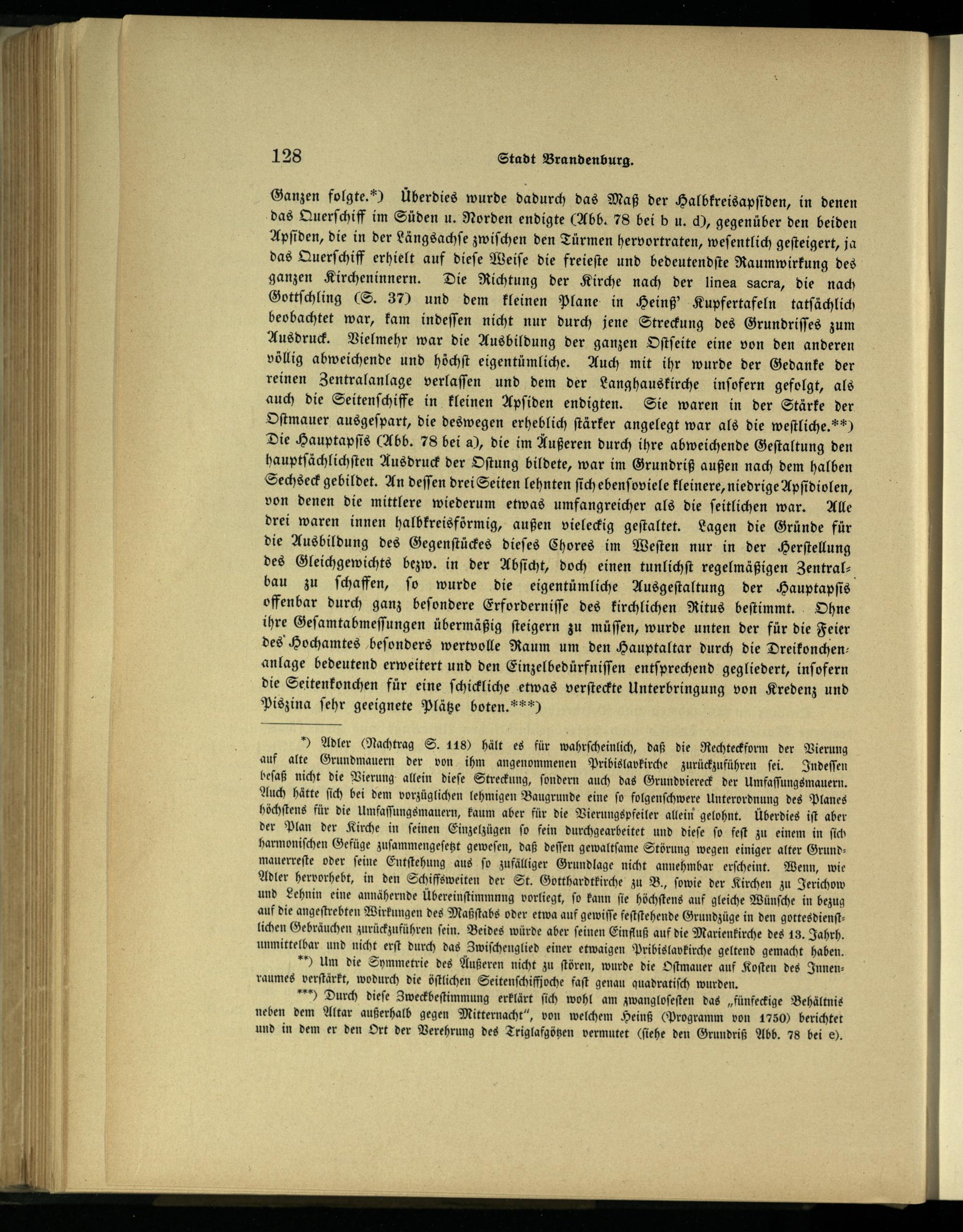 Ganzen folgte.“ Überdies wurde dadurch das Maß der Halbkreisapſiden, in denen das Querſchiff im Süden u. Norden endigte(Abb. 78 bei b u. d), gegenüber den beiden Apſiden, die in der Längsachſe zwiſchen den Türmen hervortraten, weſentlich geſteigert, ja das Querſchiff erhielt auf dieſe Weiſe die freieſte und bedeutendſte Raumwirkung des ganzen Kircheninnern. Die Richtung der Kirche nach der linea sacra, die nach Gottſchling(S. 37) und dem kleinen Plane in Heinß' Kupfertafeln tatſächlich beobachtet war, kam indeſſen nicht nur durch jene Streckung des Grundriſſes zum Ausdruck. Vielmehr war die Ausbildung der ganzen Oſtſeite eine von den anderen völlig abweichende und höchſt eigentümliche. Auch mit ihr wurde der Gedanke der reinen Zentralanlage verlaſſen und dem der Langhauskirche inſofern gefolgt, als auch die Seitenſchiffe in kleinen Apſiden endigten. Sie waren in der Stärke der Oſtmauer ausgeſpart, die deswegen erheblich ſtärker angelegt war als die weſtliche.“*) Die Hauptapſis(Abb. 78 bei a), die im Außeren durch ihre abweichende Geſtaltung den hauptſächlichſten Ausdruck der Oſtung bildete, war im Grundriß außen nach dem halben Sechseck gebildet. An deſſen drei Seiten lehnten ſich ebenſoviele kleinere, niedrige Apſidiolen, von denen die mittlere wiederum etwas umfangreicher als die ſeitlichen war. Alle drei waren innen halbkreisförmig, außen vieleckig geſtaltet. Lagen die Gründe für die Ausbildung des Gegenſtückes dieſes Chores im Weſten nur in der Herſtellung des Gleichgewichts bezw. in der Abſicht, doch einen tunlichſt regelmäßigen Zentralbau zu ſchaffen, ſo wurde die eigentümliche Ausgeſtaltung der Hauptapſis offenbar durch ganz beſondere Erforderniſſe des kirchlichen Ritus beſtimmt. Ohne ihre Geſamtabmeſſungen übermäßig ſteigern zu müſſen, wurde unten der für die Feier des Hochamtes beſonders wertvolle Raum um den Hauptaltar durch die Dreikonchenanlage bedeutend erweitert und den Einzelbedürfniſſen entſprechend gegliedert, inſofern die Seitenkonchen für eine ſchickliche etwas verſteckte Unterbringung von Kredenz und Piszina ſehr geeignete Plätze boten.“**)