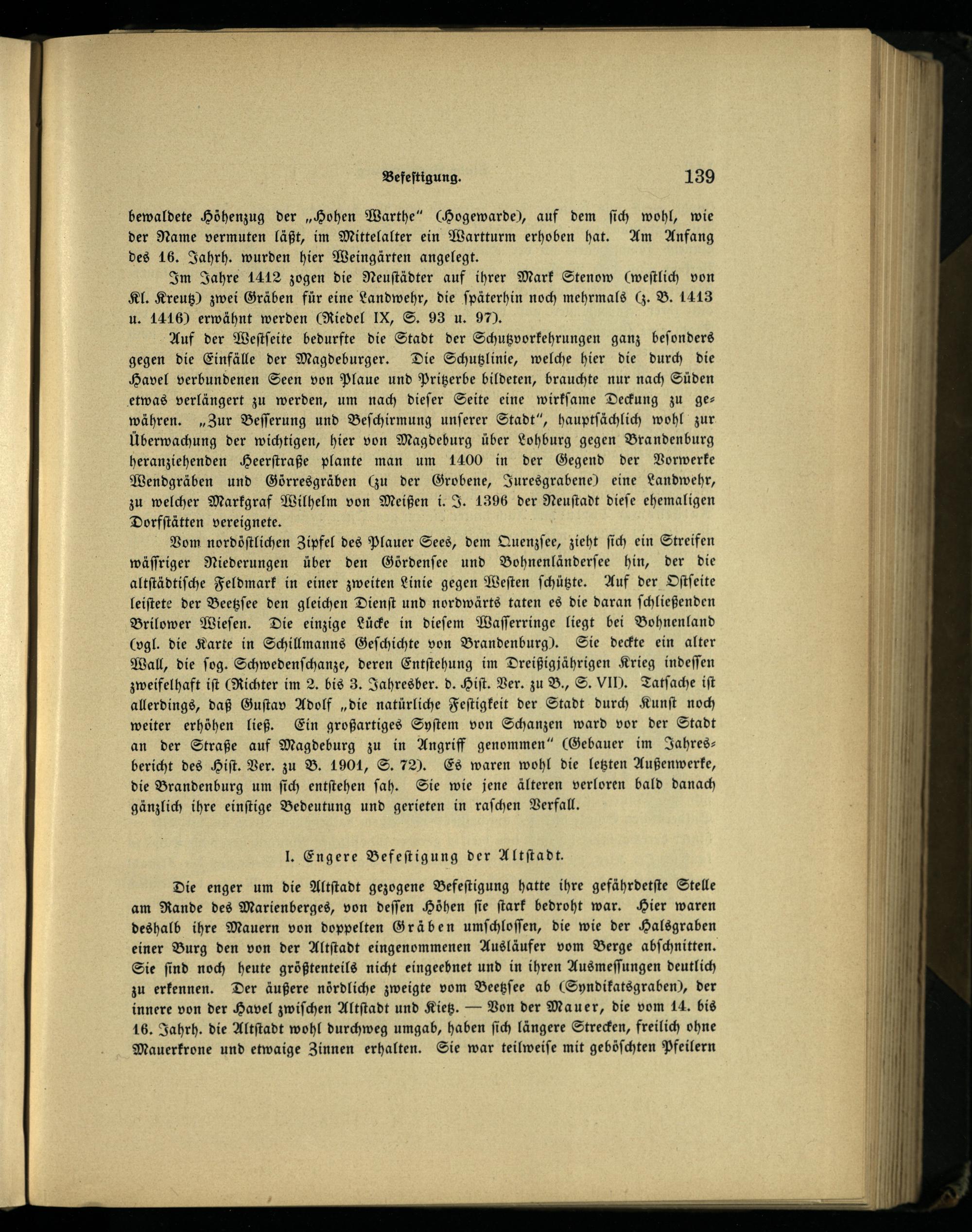 Vom nordöſtlichen Zipfel des Plauer Sees, dem Quenzſee, zieht ſich ein Streifen wäſſriger Niederungen über den Gördenſee und Bohnenländerſee hin, der die altſtädtiſche Feldmark in einer zweiten Linie gegen Weſten ſchützte. Auf der Oſtſeite leiſtete der Beetzſee den gleichen Dienſt und nordwärts taten es die daran ſchließenden Brilower Wieſen. Die einzige Lücke in dieſem Waſſerringe liegt bei Bohnenland (vgl. die Karte in Schillmanns Geſchichte von Brandenburg ). Sie deckte ein alter Wall, die ſog. Schwedenſchanze, deren Entſtehung im Dreißigjährigen Krieg indeſſen zweifelhaft iſt(Richter im 2. bis 3. Jahresber. d. Hiſt. Ver. zu B., S. VID. Tatſache iſt allerdings, daß Guſtav Adolf „die natürliche Feſtigkeit der Stadt durch Kunſt noch weiter erhöhen ließ. Ein großartiges Syſtem von Schanzen ward vor der Stadt an der Straße auf Magdeburg zu in Angriff genommen“(Gebauer im Jahresbericht des Hiſt. Ver. zu B. 1901, S. 72). Es waren wohl die letzten Außenwerke, die Brandenburg um ſich entſtehen ſah. Sie wie jene älteren verloren bald danach gänzlich ihre einſtige Bedeutung und gerieten in raſchen Verfall.
