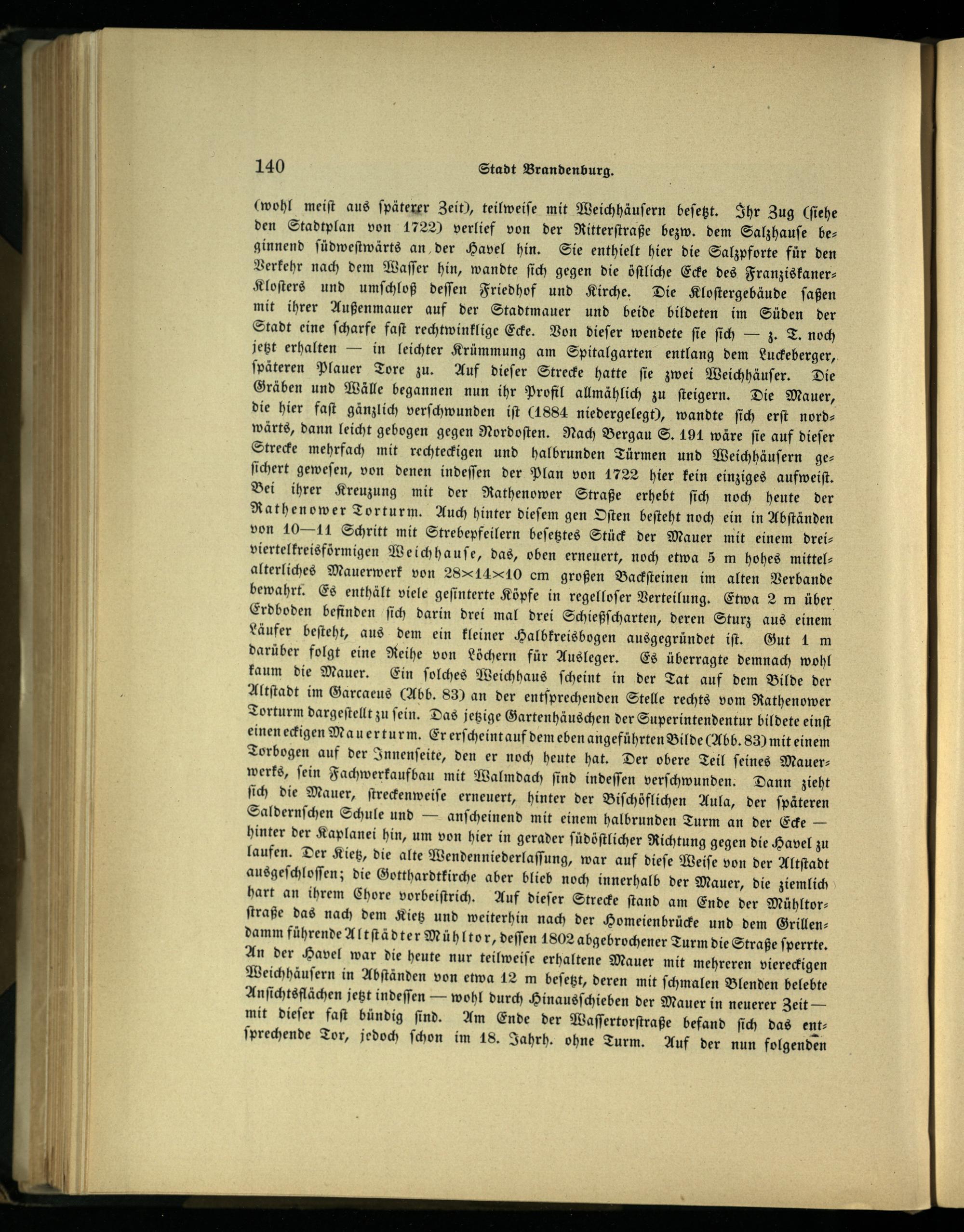 (wohl meiſt aus ſpäterer Zeit), teilweiſe mit Weichhäuſern beſetzt. Ihr Zug(ſiehe den Stadtplan von 1722) verlief von der Ritterſtraße bezw. dem Salzhauſe beginnend ſüdweſtwärts an der Havel hin. Sie enthielt hier die Salzpforte für den Verkehr nach dem Waſſer hin, wandte ſich gegen die öſtliche Ecke des Franziskaner Kloſters und umſchloß deſſen Friedhof und Kirche. Die Kloſtergebäude ſaßen mit ihrer Außenmauer auf der Stadtmauer und beide bildeten im Süden der Stadt eine ſcharfe faſt rechtwinklige Ecke. Von dieſer wendete ſie ſich— z. T. noch jetzt erhalten— in leichter Krümmung am Spitalgarten entlang dem Luckeberger, ſpäteren Plauer Tore zu. Auf dieſer Strecke hatte ſie zwei Weichhäuſer. Die Gräben und Wälle begannen nun ihr Profil allmählich zu ſteigern. Die Mauer, die hier faſt gänzlich verſchwunden iſt(1884 niedergelegt), wandte ſich erſt nordwärts, dann leicht gebogen gegen Nordoſten. Nach Bergau S. 191 wäre ſie auf dieſer Strecke mehrfach mit rechteckigen und halbrunden Türmen und Weichhäuſern geſichert geweſen, von denen indeſſen der Plan von 1722 hier kein einziges aufweiſt. Bei ihrer Kreuzung mit der Rathenower Straße erhebt ſich noch heute der Rathenower Torturm. Auch hinter dieſem gen Oſten beſteht noch ein in Abſtänden von 109— 11 Schritt mit Strebepfeilern beſetztes Stück der Mauer mit einem dreiviertelkreisförmigen Weichhauſe, das, oben erneuert, noch etwa 5 m hohes mittel— alterliches Mauerwerk von 282 14*10 em großen Backſteinen im alten Verbande bewahrt. Es enthält viele geſinterte Köpfe in regelloſer Verteilung. Etwa 2 m über Erdboden befinden ſich darin drei mal drei Schießſcharten, deren Sturz aus einem Läufer beſteht, aus dem ein kleiner Halbkreisbogen ausgegründet iſt. Gut 1 m darüber folgt eine Reihe von Löchern für Ausleger. Es überragte demnach wohl kaum die Mauer. Ein ſolches Weichhaus ſcheint in der Tat auf dem Bilde der Altſtadt im Garcaeus(Abb. 83) an der entſprechenden Stelle rechts vom Rathenower Torturm dargeſtellt zu ſein. Das jetzige Gartenhäuschen der Superintendentur bildete einſt einen eckigen Mau erturm. Er erſcheint auf dem eben angeführten Bilde(Abb. 83) mit einem Torbogen auf der Innenſeite, den er noch heute hat. Der obere Teil feines Mauerwerks, ſein Fachwerkaufbau mit Walmdach ſind indeſſen verſchwunden. Dann zieht ſich die Mauer, ſtreckenweiſe erneuert, hinter der Biſchöflichen Aula, der ſpäteren Saldernſchen Schule und— anſcheinend mit einem halbrunden Turm an der Ecke— hinter der Kaplanei hin, um von hier in gerader ſüdöſtlicher Richtung gegen die Havel zu laufen. Der Kietz, die alte Wendenniederlaſſung, war auf dieſe Weiſe von der Altſtadt ausgeſchloſſen; die Gotthardtkirche aber blieb noch innerhalb der Mauer, die ziemlich hart an ihrem Chore vorbeiſtrich. Auf dieſer Strecke ſtand am Ende der Mühltorſtraße das nach dem Kietz und weiterhin nach der Homeienbrücke und dem Grillen: damm führende Altſtädter Mühltor, deſſen 1802 abgebrochener Turm die Straße ſperrte. An der Havel war die heute nur teilweiſe erhaltene Mauer mit mehreren viereckigen Weichhäuſern in Abſtänden von etwa 12 m beſetzt, deren mit ſchmalen Blenden belebte Anſichtsflächen jetzt indeſſen— wohl durch Hinausſchieben der Mauer in neuerer Zeit— mit dieſer faſt bündig ſind. Am Ende der Waſſertorſtraße befand ſich das entſprechende Tor, jedoch ſchon im 18. Jahrh. ohne Turm. Auf der nun folgenden