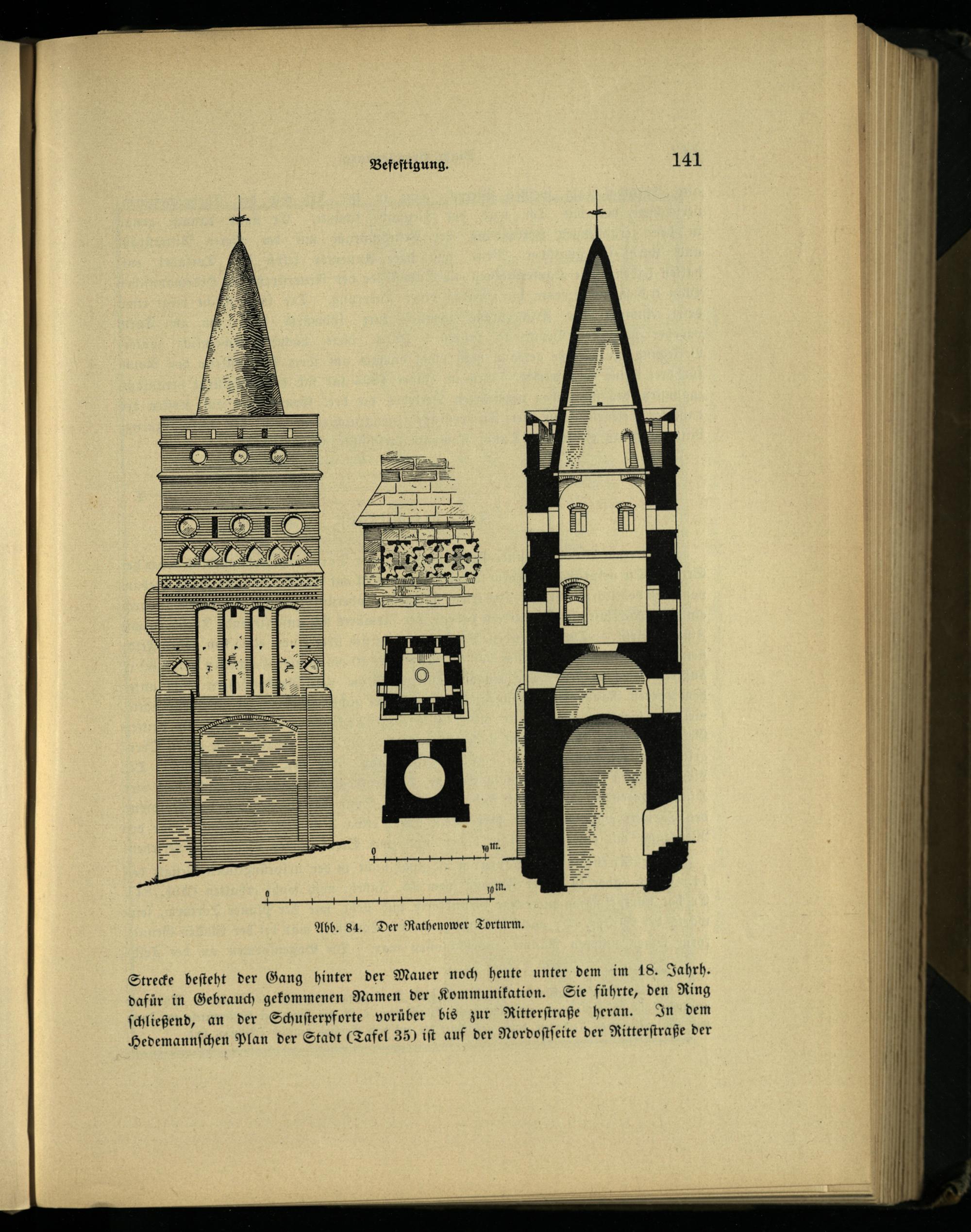 Strecke beſteht der Gang hinter der Mauer noch heute unter dem im 18. Jahrh. dafür in Gebrauch gekommenen Namen der Kommunikation. Sie führte, den Ring ſchließend, an der Schuſterpforte vorüber bis zur Ritterſtraße heran. In dem Hedemannſchen Plan der Stadt(Tafel 35) iſt auf der Nordoſtſeite der Ritterſtraße der