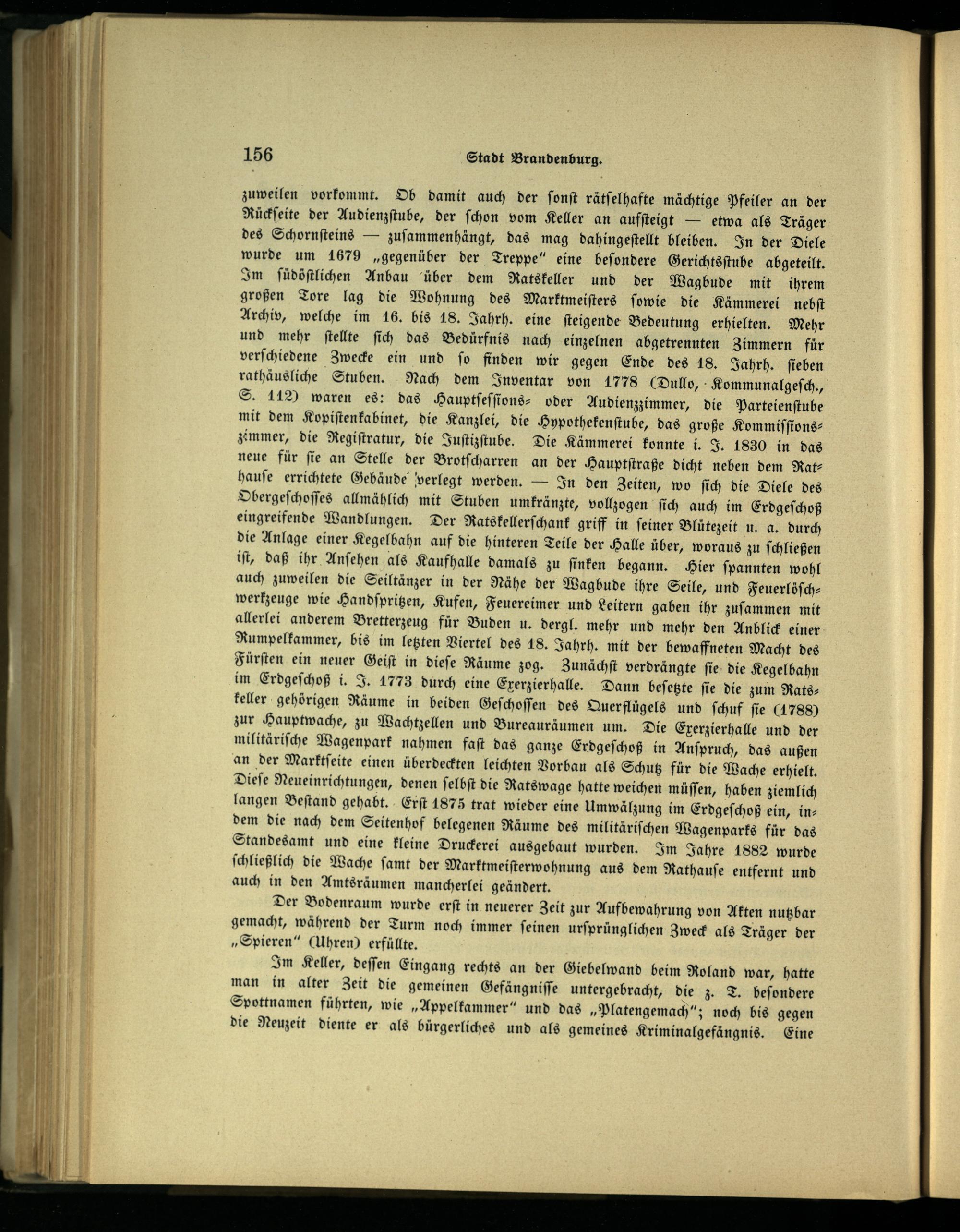 zuweilen vorkommt. Ob damit auch der ſonſt rätſelhafte mächtige Pfeiler an der Rückſeite der Audienzſtube, der ſchon vom Keller an aufſteigt— etwa als Träger des Schornſteins— zuſammenhängt, das mag dahingeſtellt bleiben. In der Diele wurde um 1679„gegenüber der Treppe“ eine beſondere Gerichtsſtube abgeteilt. Im ſüdöſtlichen Anbau über dem Ratskeller und der Wagbude mit ihrem großen Tore lag die Wohnung des Marktmeiſters ſowie die Kämmerei nebſt Archiv, welche im 16. bis 18. Jahrh. eine ſteigende Bedeutung erhielten. Mehr und mehr ſtellte ſich das Bedürfnis nach einzelnen abgetrennten Zimmern für verſchiedene Zwecke ein und ſo finden wir gegen Ende des 18. Jahrh. ſieben rathäusliche Stuben. Nach dem Inventar von 1778(Dullo, Kommunalgeſch., S. 112) waren es: das Hauptſeſſions⸗ oder Audienzzimmer, die Parteienſtube mit dem Kopiſtenkabinet, die Kanzlei, die Hypothekenſtube, das große Kommiſſionszimmer, die Regiſtratur, die Juſtizſtube. Die Kämmerei konnte i. J. 1830 in das neue für ſie an Stelle der Brotſcharren an der Hauptſtraße dicht neben dem Rathauſe errichtete Gebäude verlegt werden.— In den Zeiten, wo ſich die Diele des Obergeſchoſſes allmählich mit Stuben umkränzte, vollzogen ſich auch im Erdgeſchoß eingreifende Wandlungen. Der Ratskellerſchank griff in ſeiner Blütezeit u. a. durch die Anlage einer Kegelbahn auf die hinteren Teile der Halle über, woraus zu ſchließen iſt, daß ihr Anſehen als Kaufhalle damals zu ſinken begann. Hier ſpannten wohl auch zuweilen die Seiltänzer in der Nähe der Wagbude ihre Seile, und Feuerlöſchwerkzeuge wie Handſpritzen, Kufen, Feuereimer und Leitern gaben ihr zuſammen mit allerlei anderem Bretterzeug für Buden u. dergl. mehr und mehr den Anblick einer Rumpelkammer, bis im letzten Viertel des 18. Jahrh. mit der bewaffneten Macht des Fürſten ein neuer Geiſt in dieſe Räume zog. Zunächſt verdrängte ſie die Kegelbahn im Erdgeſchoß i. J. 1773 durch eine Exerzierhalle. Dann beſetzte ſie die zum Ratskeller gehörigen Räume in beiden Geſchoſſen des Querflügels und ſchuf ſie(1788) zur Hauptwache, zu Wachtzellen und Bureauräumen um. Die Exerzierhalle und der militäriſche Wagenpark nahmen faſt das ganze Erdgeſchoß in Anſpruch, das außen an der Marktſeite einen überdeckten leichten Vorbau als Schutz für die Wache erhielt. Dieſe Neueinrichtungen, denen ſelbſt die Ratswage hatte weichen müſſen, haben ziemlich langen Beſtand gehabt. Erſt 1875 trat wieder eine Umwälzung im Erdgeſchoß ein, indem die nach dem Seitenhof belegenen Räume des militäriſchen Wagenparks für das Standesamt und eine kleine Druckerei ausgebaut wurden. Im Jahre 1882 wurde ſchließlich die Wache ſamt der Marktmeiſterwohnung aus dem Rathauſe entfernt und auch in den Amtsräumen mancherlei geändert.